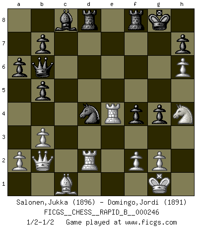 Last move : 1/2-1/2 2017 January 15 10:6:46 [Event "FICGS__CHESS__RAPID_B__000246"] [Site "FICGS"] [Date "2016.11.08"] [Round "1"] [White "Salonen,Jukka"] [Black "Domingo,Jordi"] [Result "1/2-1/2"] [WhiteElo "1896"] [BlackElo "1891"] 1.e4 e5 2.Nf3 Nc6 3.Bb5 Bb4 4.c3 Ba5 5.O-O Nge7 6.Qa4 Bb6 7.d4 Ng6 8.Bg5 f6 9.Be3 O-O 10.Nbd2 a6 11.h4 exd4 12.Bc4+ Kh8 13.cxd4 d6 14.h5 Nge7 15.Bb3 d5 16.h6 g5 17.Rad1 g4 18.Nh4 f5 19.exd5 Nxd5 20.Bxd5 Qxd5 21.Nc4 f4 22.Qa3 Be6 23.Nxb6 cxb6 24.Bc1 b5 25.Rfe1 Rad8 26.Qd3 Nxd4 27.b3 Kg8 28.Qc3 Qc6 29.Qb2 Qb6 30.Rd2 Bc8 31.Re4 1/2-1/2 Ruy Lopez (Spanish Opening) Kingside Castling by player White (move 5) Kingside Castling by player Black (move 9) This chess game ended in a draw. Follow this game move after move (download)Of all my Russian books, the defense contains and diffuses the greatest 'warmth' which may seem odd seeing how supremely abstract Chess is supposed to be. (Vladimir Nabokov) Schach sollte überall auf der Welt Schulfach werden. Es fördert die geistige Auseinandersetzung. Es lehrt die Demut in der Niederlage. (Garry Kasparov) Hay dos clases de hombres: aquellos que se conforman en dejarse llevar por las circunstancias y que juegan barajas y aquellos decididos a controlar las circunstancias y que juegan al Ajedrez. (Mortimer Collins) Soyez une menace à chaque fois que vous vous asseyez pour jouer. (Ken Smith) Winning isn't everything... but losing is nothing. (Mednis)