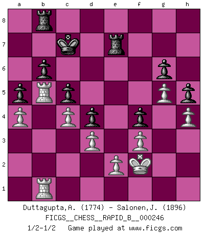 Last move : 1/2-1/2 2017 February 18 6:50:24 [Event "FICGS__CHESS__RAPID_B__000246"] [Site "FICGS"] [Date "2016.11.08"] [Round "1"] [White "Duttagupta,Aniruddha"] [Black "Salonen,Jukka"] [Result "1/2-1/2"] [WhiteElo "1774"] [BlackElo "1896"] 1.c4 e5 2.g3 Nf6 3.Bg2 d5 4.cxd5 Nxd5 5.Nc3 Nxc3 6.bxc3 Nc6 7.Nf3 Bc5 8.O-O O-O 9.d3 Bb6 10.Ba3 Re8 11.Nd2 Be6 12.Ne4 Qd7 13.Ng5 Bg4 14.h3 Bh5 15.Ne4 f5 16.Nc5 Bxc5 17.Bxc5 b6 18.Be3 Bf7 19.Qa4 Bd5 20.Bxd5+ Qxd5 21.Qb3 Qf7 22.Qxf7+ Kxf7 23.Rfd1 Rad8 24.f3 Rd6 25.Kf2 Na5 26.g4 f4 27.Bd2 Rh8 28.c4 Nc6 29.h4 h5 30.g5 Nd4 31.a4 a5 32.Rab1 c5 33.Bc3 Re8 34.Bxd4 exd4 35.Rb5 R8e6 36.Re1 Ke7 37.Rd1 Kd7 38.Rd2 Re8 39.Rc2 Kc7 40.Rcb2 g6 41.Kg2 Rde6 42.Kf2 Re5 43.Kf1 Rb8 44.Rb1 Re7 45.Kf2 1/2-1/2 English Opening Kingside Castling by player White (move 8) Kingside Castling by player Black (move 8) This chess game ended in a draw. Follow this game move after move (download)In Chess, as it is played by masters, chance is practically eliminated. (Emanuel Lasker) Mein Gehirn das ist mein zweitwichtigstes Organ [Aus dem Film: Der Schläfer]. (Woody Allen) La maestría del Ajedrez consiste esencialmente en analizar posiciónes de Ajedrez con precisión. (Mikhail Botvinnik) Comme les marins qui ont mille raisons différentes d'aller en mer, les joueurs d'échecs en ont tout autant avant de s'installer devant une table et jouer... (Vincent Bertignac, philosophe) The man who strikes first admits that his ideas have given out. (Chinese proverb)