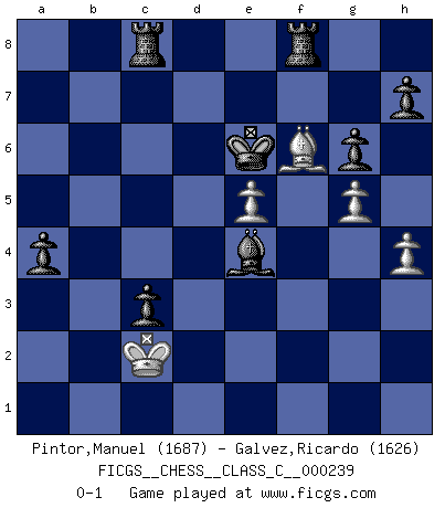 Last move : 0-1 2017 January 13 19:9:9 [Event "FICGS__CHESS__CLASS_C__000239"] [Site "FICGS"] [Date "2016.11.08"] [Round "1"] [White "Pintor,Manuel"] [Black "Galvez,Ricardo"] [Result "0-1"] [WhiteElo "1687"] [BlackElo "1626"] 1.e4 e5 2.f4 Bc5 3.Nf3 d6 4.Bc4 Nf6 5.fxe5 dxe5 6.Bxf7+ Kxf7 7.Nxe5+ Kf8 8.Qf3 Qe8 9.Qf4 Bd6 10.d4 Nc6 11.O-O Nxd4 12.Qh4 Qxe5 13.Bg5 Nxc2 14.Rxf6+ Ke8 15.Qh5+ g6 16.Qh4 Qd4+ 17.Qf2 Bc5 18.Qxd4 Bxd4+ 19.Kf1 Bxf6 20.Bxf6 Rf8 21.e5 Be6 22.Ke2 Nxa1 23.Kd2 Bxa2 24.Nc3 Be6 25.Nb5 Kd7 26.Nd4 Bd5 27.g4 Rae8 28.g5 a5 29.Kc3 a4 30.h4 Nb3 31.Nc2 b5 32.Na3 c6 33.Nc2 c5 34.Kd3 Ke6 35.Kc3 b4+ 36.Kd3 c4+ 37.Ke3 c3 38.bxc3 bxc3 39.Kd3 Rc8 40.Na3 Na1 41.Nc2 Nxc2 42.Kxc2 Be4+ 0-1 KGD : Classical variation Kingside Castling by player White (move 11) Player Black won this chess game. Follow this game move after move (download)The passed pawn is a criminal, who should be kept under lock and key. Mild measures, such as police surveillance, are not sufficient. (Nimzovitch) Ich glaube, ich kenne inzwischen die Gründe für mein Versagen: schachliche Charakterfehler. Ich war nie ein Wunderkind und in meiner gesamten menschlichen Entwicklung immer zu langsam. (Viktor Kortschnoi) Fischer sacrificó virtualmente todo lo que la mayoría de nosotros los 'debiles' (término que él usa) valoramos, respetamos y apreciamos por el amor de un astuto, a menudo hermoso tablero de juego, por el privilegio ambivalente de ser su mas grande maestro. (Paul Kollar) Si je n'étais pas joueur d'échecs, je serais le meilleur dans quelque chose d'autre. (Anatoli Karpov) I think your argument is specious - I think your tie is ugly. (Gregory House to Dr. Foreman, House M.D.)