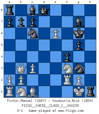 Last move : 0-1 2016 November 18 8:50:43 [Event "FICGS__CHESS__CLASS_C__000239"] [Site "FICGS"] [Date "2016.11.08"] [Round "1"] [White "Pintor,Manuel"] [Black "Voudouris,Nick"] [Result "0-1"] [WhiteElo "1687"] [BlackElo "1804"] 1.e4 e5 2.f4 exf4 3.Nf3 g5 4.Bc4 Nc6 5.d4 Bg7 6.O-O d6 7.Bxf7+ Kxf7 8.c3 h6 9.Qb3+ Kg6 10.h4 Nf6 11.e5 dxe5 12.dxe5 Nh5 13.hxg5 hxg5 14.e6 Ng3 15.Rf2 Rh1+ 0-1 KGA : Blachly gambit Kingside Castling by player White (move 6) Player Black won this chess game. Follow this game move after move (download)It is not a move, even the best move that you must seek, but a realizable plan. (Eugene Znosko-Borovsky) Ich habe Kasparov in Rente geschickt. (Veselin Topalov) Todo se encuentra en un estado de flujo y esto incluye al mundo del Ajedrez. (Mikhail Botvinnik) On est toujours la mazette de quelqu'un d'autre. (Anonyme) There's always a bigger fish. (Qui-Gon Jinn in Star Wars ep.1)