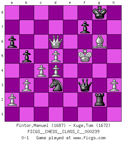 Last move : 0-1 2016 November 30 1:43:47 [Event "FICGS__CHESS__CLASS_C__000239"] [Site "FICGS"] [Date "2016.11.08"] [Round "1"] [White "Pintor,Manuel"] [Black "Kuge,Tom"] [Result "0-1"] [WhiteElo "1687"] [BlackElo "1672"] 1.e4 e5 2.f4 exf4 3.Nf3 d5 4.exd5 Bd6 5.Bc4 Nf6 6.d3 O-O 7.O-O Bg4 8.h3 Bh5 9.Nc3 Nbd7 10.Qe1 a6 11.Ne4 b5 12.Bb3 Bxf3 13.Rxf3 Nh5 14.Nxd6 cxd6 15.Bxf4 Nxf4 16.Rxf4 Ne5 17.Qg3 Ng6 18.Rf5 Re8 19.Raf1 Ra7 20.c4 Qb6+ 21.Kh2 Re3 22.R1f3 Rae7 23.Bd1 Re1 24.Rf1 Rxf1 25.Rxf1 Ne5 26.b3 Qd4 27.Be2 g6 28.Rf4 Qb2 29.Bh5 Qb1 30.d4 Nd3 31.Rf6 Re1 32.Qxd6 Rh1+ 33.Kg3 Qe1+ 34.Kg4 Rg1 35.Rxg6+ hxg6 36.Bxg6 Rxg2+ 37.Kf5 Qf1+ 38.Ke4 Qe2+ 39.Kf5 Qf3+ 0-1 KGA : Abbazia defense (Classical defense, Modern defense!) Kingside Castling by player Black (move 6) Kingside Castling by player White (move 7) Player Black won this chess game. Follow this game move after move (download)After a bad opening, there is hope for the middle game. After a bad middle game, there is hope for the endgame. But once you are in the endgame, the moment of truth has arrived. (Edmar Mednis) Zum Sieg gelangt man nicht, wenn man gut, sondern nur wenn man besser spielt (Savielly Grigorievitsch Tartakower) El Ajedrez, como cualquier otra actividad creativa, puede existir solo a través de méritos combinados de aquellos que tienen talento creativo y de aquellos que tienen la habilidad de organizar un trabajo creativo. (Mikhail Botvinnik) Le thème de l'attaque double intervient d'une manière ou d'une autre dans l'immense majorité des combinaisons. (Youri Averbakh) Those parts of the system that you can hit with a hammer (not advised) are called hardware; those program instructions that you can only curse at are called software. (Anonymous)