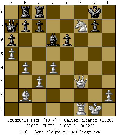 Last move : 1-0 2017 March 31 15:44:1 [Event "FICGS__CHESS__CLASS_C__000239"] [Site "FICGS"] [Date "2016.11.08"] [Round "1"] [White "Voudouris,Nick"] [Black "Galvez,Ricardo"] [Result "1-0"] [WhiteElo "1804"] [BlackElo "1626"] 1.d4 d5 2.e3 Nf6 3.Bd3 Nc6 4.f4 Bg4 5.Nf3 e6 6.c3 Bd6 7.O-O O-O 8.Qe1 Bf5 9.Qe2 Re8 10.Nbd2 Bxd3 11.Qxd3 a6 12.a4 Ne7 13.b4 h6 14.Re1 Qb8 15.a5 Qa7 16.Bb2 Rad8 17.Ne5 Nf5 18.e4 Ne7 19.Qe2 dxe4 20.Nxe4 Ned5 21.Nxf6+ Nxf6 22.Rf1 Rb8 23.Rf3 Red8 24.Raf1 Rdc8 25.g4 Nh7 26.g5 hxg5 27.fxg5 Nxg5 28.Nxf7 Nxf3+ 29.Qxf3 1-0 Queen's pawn : Stonewall attack Kingside Castling by player White (move 7) Kingside Castling by player Black (move 7) Player White won this chess game. Follow this game move after move (download)First-class players lose to second class players because second-class players sometimes play a first-class game. (Tarrasch) Ich bewundere Kasparows phantasievolle Angriffssiege aus den Achtzigern und Neunzigern, aber wenn man sie mit dem Computer überprüft, nimmt der Computer in jeder zweiten Partie die Opfer an, verteidigt sich und gewinnt. (Vladimir Kramnik) Un entendimiento minucioso de las típicas continuaciones de mate hacen de las mas complicadas combinaciones de sacrificio que conducen hacia ellas no solo no dificiles, sino casi un asunto de rutina. (Siegbert Tarrasch) C'est la seule position que je connaisse où les deux camps sont mals. Propos prêtés à V. Anand. My poor ole parrot... Is not in the circulation of displays ....poo hoo hoo :) (Wayne Lowrance's enigma)