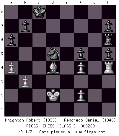 Last move : 1/2-1/2 2017 April 4 3:48:26 [Event "FICGS__CHESS__CLASS_C__000239"] [Site "FICGS"] [Date "2016.11.08"] [Round "1"] [White "Knighton,Robert"] [Black "Reboredo,Daniel"] [Result "1/2-1/2"] [WhiteElo "1933"] [BlackElo "1946"] 1.g4 e5 2.Bg2 d5 3.d4 exd4 4.Qxd4 Nc6 5.Qxd5 Qxd5 6.Bxd5 Nge7 7.Be4 Bxg4 8.Bd2 O-O-O 9.Nc3 g6 10.h3 Be6 11.O-O-O Bg7 12.e3 Rd7 13.Be1 Rhd8 14.Rxd7 Rxd7 15.Nge2 Nd5 16.a3 Nce7 17.Bd3 Rd8 18.Ne4 f5 19.Ng5 Bg8 20.h4 c5 21.Rg1 Nc6 22.Nh3 Bh6 23.Nef4 Nxf4 24.Nxf4 Ne5 25.Be2 Bc4 26.Bxc4 Nxc4 27.h5 Bxf4 28.exf4 gxh5 29.a4 Re8 30.Rh1 Re6 31.b3 Nb6 32.Bc3 Nd5 33.Be5 Rh6 34.Rh4 c4 35.Bd4 cxb3 36.cxb3 a6 37.Kd2 1/2-1/2 Grob's attack Queenside Castling by player Black (move 8) Queenside Castling by player White (move 11) This chess game ended in a draw. Follow this game move after move (download)Checkers is for tramps. (Paul Morphy) Es gibt zwei Arten von Opfern: Korrekte und meine. (Mikhail Nekhemyevich Tal) Es el objetivo de la escuela moderna no tratar cada posición de acuerdo a una regla general, sino de acuerdo al principio inherente en la posición. (Richard Reti) Je ne crois pas en la psychologie, je crois aux bons coups. (Robert Fischer) To be champion requires more than simply being a strong player; one has to be a strong human being as well. (Anatoly Karpov)
