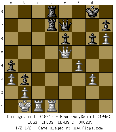 Last move : 1/2-1/2 2017 February 23 21:56:14 [Event "FICGS__CHESS__CLASS_C__000239"] [Site "FICGS"] [Date "2016.11.08"] [Round "1"] [White "Domingo,Jordi"] [Black "Reboredo,Daniel"] [Result "1/2-1/2"] [WhiteElo "1891"] [BlackElo "1946"] 1.e4 e6 2.d4 d5 3.Nc3 Nf6 4.e5 Nfd7 5.f4 c5 6.Nf3 Nc6 7.Be3 cxd4 8.Nxd4 Bc5 9.Qd2 O-O 10.O-O-O a6 11.Qf2 Bxd4 12.Bxd4 b5 13.Be3 b4 14.Na4 a5 15.h4 Ba6 16.h5 Bxf1 17.h6 g6 18.Rhxf1 f5 19.exf6 Nxf6 20.Qe2 Ne4 21.Qd3 Qc7 22.Kb1 Rac8 23.Rc1 Ne7 24.c4 Qb7 25.Nc5 Nxc5 26.Bxc5 dxc4 27.Qxc4 Nd5 28.Qd4 Rf7 29.Ka1 Nf6 30.Rfd1 Re8 31.g3 Qb5 32.Bb6 a4 33.Bc5 b3 34.a3 Rd7 35.Qxf6 Qxc5 36.Kb1 Qe7 37.Qe5 Red8 1/2-1/2 French : Steinitz, Boleslavsky variation Kingside Castling by player Black (move 9) Queenside Castling by player White (move 10) This chess game ended in a draw. Follow this game move after move (download)Chess is a more highly symbolic game, but the aggressions are therefore even more frankly represented in the play. It probably began as a war game; that is, the representation of a miniature battle between the forces of two kingdoms. (Karl Meninger) Bis zum Jahr 1971 verlief in meiner Schachkariere alles glatt. Dieses dramatische Match [Fischer-Taimanov 6:0] machte mein Leben zur Hölle. (Mark Taimanov) El juego del Ajedrez no es solamente una diversión quieta; algunas cualidades muy valuables de la mente se pueden adquirir y cultivar con el, como convertirlos en habitos disponibles para toda ocasión; ya que la vida es algo así como el Ajedrez. (Benjamin Franklin) La vérité est comme le meilleur coup aux échecs : elle existe, mais il faut la chercher. (Arturo Perez-Reverte) Pretend inferiority and encourage his arrogance. (Sun Tzu)