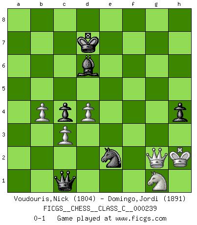 Last move : 0-1 2017 July 14 9:14:5 [Event "FICGS__CHESS__CLASS_C__000239"] [Site "FICGS"] [Date "2016.11.08"] [Round "1"] [White "Voudouris,Nick"] [Black "Domingo,Jordi"] [Result "0-1"] [WhiteElo "1804"] [BlackElo "1891"] 1.d4 d5 2.e3 Nf6 3.Bd3 c5 4.c3 Nc6 5.f4 Bg4 6.Nf3 e6 7.O-O Bd6 8.Qe1 Bf5 9.Qe2 O-O 10.Ne5 Qb6 11.Kh1 Ne7 12.Nd2 Rac8 13.a4 Qc7 14.g4 Bxd3 15.Nxd3 b6 16.g5 Nd7 17.b3 Nf5 18.Bb2 Qb7 19.Kg1 Rfd8 20.a5 Nf8 21.Nf3 Ng6 22.axb6 axb6 23.Nf2 b5 24.Rab1 Ngh4 25.Nxh4 Nxh4 26.Nh1 c4 27.b4 Ra8 28.Qf2 Nf5 29.Ng3 Ne7 30.Ra1 Rxa1 31.Rxa1 Ra8 32.Qf1 Nc8 33.Kf2 Nb6 34.Rxa8+ Qxa8 35.Qa1 Na4 36.h4 Qf8 37.Bc1 f6 38.Bd2 Qf7 39.gxf6 Qxf6 40.h5 g5 41.hxg6 Qxg6 42.e4 Qg4 43.Qc1 Kf8 44.exd5 exd5 45.Ne2 Qh5 46.Ng3 Qf7 47.Ne2 h5 48.Qb1 Nb6 49.Qh1 Nd7 50.Qh3 Nf6 51.Qc8+ Ke7 52.Qb7+ Nd7 53.Qxb5 h4 54.Qc6 Qg8 55.Ng1 Qg3+ 56.Kf1 Nf6 57.Qb7+ Kd8 58.Qb6+ Kd7 59.Qa7+ Ke6 60.Qa8 Qd3+ 61.Ke1 Qb1+ 62.Kf2 Ne4+ 63.Kg2 Nxd2 64.Qg8+ Ke7 65.Qg5+ Kd7 66.Qxd5 Qf1+ 67.Kh1 Qxf4 68.Qg2 Ne4 69.Nh3 Qc1+ 70.Ng1 Ng3+ 71.Kh2 Ne2 0-1 Queen's pawn : Stonewall attack Kingside Castling by player White (move 7) Kingside Castling by player Black (move 9) Player Black won this chess game. Follow this game move after move (download)Even the laziest King flees wildly in the face of a double check ! (Aaron Nimzowitsch) Du musst nicht gut spielen, es reicht, wenn du besser spielst als dein Gegner. (Anonymous) La belleza de un movimiento no se refleja solo en su apariencia, sino en el pensamiento detrás de él. (Siegbert Tarrasch) Soyez une menace à chaque fois que vous vous asseyez pour jouer. (Ken Smith) Cactus - It is depressed cucumber. (Ilmars Cirulis)