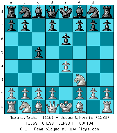 Last move : 0-1 2016 December 23 9:12:12 [Event "FICGS__CHESS__CLASS_F__000184"] [Site "FICGS"] [Date "2016.11.11"] [Round "1"] [White "Nezumi,Mashi"] [Black "Joubert,Hennie"] [Result "0-1"] [WhiteElo "1116"] [BlackElo "1228"] 1.e4 c5 2.Nf3 e6 0-1 This chess game has been lost on time (started : 2016.11.11 17:17:18) Sicilian defense Player Black won this chess game. Follow this game move after move (download)The beauty of a move lies not in its' appearance but in the thought behind it. (Siegbert Tarrasch) Rauchen ist dem Schachspieler bei seiner Arbeit, also im Wettkampf, untersagt. (Viktor Kortschnoi) Fischer es una tragedia del Ajedrez Americano a la par con Morphy y Pillsbury. (Mig Greengard) Dieu déplace le joueur, et celui-ci la pièce. Quel Dieu derrière Dieu commence donc la trame ? Arturo Perez-Reverte (prix de littérature policière 1993). In every real man a child is hidden that wants to play. (Friedrich Nietzsche)