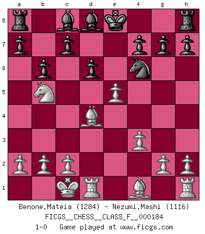 Last move : 1-0 2017 January 18 0:12:3 [Event "FICGS__CHESS__CLASS_F__000184"] [Site "FICGS"] [Date "2016.11.11"] [Round "1"] [White "Benone,Mateia"] [Black "Nezumi,Mashi"] [Result "1-0"] [WhiteElo "1284"] [BlackElo "1116"] 1.e4 e5 2.Nf3 Nc6 3.d4 exd4 4.Nxd4 Nxd4 5.Qxd4 Qf6 6.Be3 Qxd4 7.Bxd4 b6 8.Nc3 Nf6 9.f3 d6 10.O-O-O Be7 11.Nb5 Bd8 12.e5 1-0 Scotch game Queenside Castling by player White (move 10) Player White won this chess game. Follow this game move after move (download)Chess is no whit inferior to the violin, and we have a large number of professional violinists. (Mikhail Botvinnik) Wenn ich gewinne bin ich ein Genie. Wenn nicht, dann bin ich keines. (Robert James Fischer) Hoy en día, si tu no eres un Gran Maestro a los 14 años, es mejor que lo olvides. (Anand Viswanathan) Celui qui prend des risques peut perdre, celui qui n'en prend pas perd toujours. (Xavier Tartacover) Experience is the name we all give to our mistakes. (Oscar Wilde)