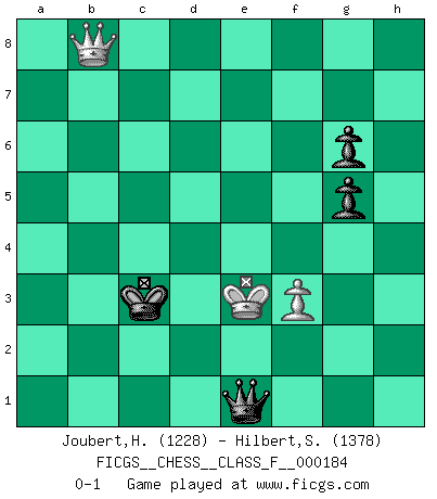Last move : 0-1 2017 February 21 12:9:36 [Event "FICGS__CHESS__CLASS_F__000184"] [Site "FICGS"] [Date "2016.11.11"] [Round "1"] [White "Joubert,Hennie"] [Black "Hilbert,Stephan J."] [Result "0-1"] [WhiteElo "1228"] [BlackElo "1378"] 1.e4 e5 2.Nf3 f5 3.Nxe5 Nf6 4.exf5 Qe7 5.Qe2 d6 6.Nf3 Bxf5 7.Qxe7+ Bxe7 8.d3 O-O 9.Nc3 Nc6 10.Be2 Rae8 11.O-O Bd7 12.Be3 Ng4 13.h3 Nxe3 14.fxe3 Bf6 15.Rab1 Rxe3 16.Rbe1 Nd4 17.Bd1 Nxf3+ 18.gxf3 Rxe1 19.Rxe1 Bxh3 20.Nd5 Bd8 21.Kh2 Bd7 22.Kg3 c6 23.Nf4 d5 24.Ng2 Rf6 25.c3 Rg6+ 26.Kf2 Kf8 27.Bc2 Bh3 28.Nf4 Bh4+ 29.Ke2 Bxe1 30.Nxg6+ hxg6 31.Kxe1 Ke7 32.Kf2 Kf6 33.d4 Bf5 34.Bd1 g5 35.Kg3 g6 36.Be2 Ke6 37.Bf1 b6 38.Be2 c5 39.dxc5 bxc5 40.Bd1 d4 41.cxd4 cxd4 42.b4 Ke5 43.a4 d3 44.b5 Bd7 45.Bb3 Be6 46.Bd1 Kd4 47.Kf2 Kc3 48.Ke3 Bb3 49.Bxb3 Kxb3 50.a5 Kc3 51.b6 axb6 52.axb6 d2 53.b7 d1Q 54.b8Q Qe1+ 0-1 Latvian counter-gambit Kingside Castling by player Black (move 8) Kingside Castling by player White (move 11) 10 pieces endgame at move 49 : White KBPPP , Black KPPPP WHITE : King + 1 Bishop 3 Pawns BLACK : King + 4 Pawns 9 pieces endgame at move 49 : White KPPP , Black KPPPP WHITE : King + 3 Pawns BLACK : King + 4 Pawns 8 pieces endgame at move 51 : White KPP , Black KPPPP WHITE : King + 2 Pawns BLACK : King + 4 Pawns 7 pieces endgame at move 52 : White KPP , Black KPPP WHITE : King + 2 Pawns BLACK : King + 3 Pawns Promotion Queen by player Black (move 53) Promotion Queen by player White (move 54) Player Black won this chess game. Follow this game move after move (download)A big shock; the best chess player in history has passed away. (Lajos Portisch, about Bobby Fischer's death) Privat ist Kortschnoi kein schlechter Mensch, sehr sympathisch. Aber während des Spiels ist er grausam. Er will dich töten. (Miguel Najdorf) Una victoria por una combinación errónea, aunque sea espectacular, me llena de horror artístico. (Wilhelm Steinitz) Les échecs, c'est la lutte contre l'erreur. (Johannes Zukertort) Your best chance to get a Royal Flush in a casino is in the bathroom. (Anonymous)