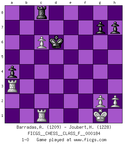 Last move : 1-0 2016 December 17 14:24:10 [Event "FICGS__CHESS__CLASS_F__000184"] [Site "FICGS"] [Date "2016.11.11"] [Round "1"] [White "Barradas,Anderson"] [Black "Joubert,Hennie"] [Result "1-0"] [WhiteElo "1209"] [BlackElo "1228"] 1.e4 c5 2.Nf3 e6 3.d4 cxd4 4.Nxd4 Nf6 5.Nc3 Qb6 6.Be2 Bc5 7.Be3 O-O 8.O-O Qxb2 9.Qd2 Qb6 10.Na4 Qb4 11.Nxc5 Qxd2 12.Bxd2 b6 13.Nd3 Bb7 14.e5 Ne4 15.Bb4 Re8 16.f3 Nc5 17.Nxc5 bxc5 18.Bxc5 Nc6 19.c3 Nxe5 20.Nb5 Rec8 21.Bd4 Nc6 22.Nd6 Rcb8 23.Rab1 Nd8 24.a4 a5 25.Bb6 Bc6 26.Bxd8 Rxd8 27.Bd3 Bxa4 28.Be4 Rab8 29.Ra1 Bb5 30.Rfb1 f5 31.Nxb5 fxe4 32.fxe4 Ra8 33.c4 d5 34.Nc7 Ra7 35.Nxe6 Re8 36.exd5 a4 37.Ra3 Rc8 38.c5 Kf7 39.c6 Ra5 40.Rd1 Rxd5 41.Rxd5 Kxe6 42.Rc5 Kd6 43.Rc1 1-0 Sicilian : Anderssen variation Kingside Castling by player Black (move 7) Kingside Castling by player White (move 8) Player White won this chess game. Follow this game move after move (download)The game of Chess is not merely an idle amusement; several very valuable qualities of the mind are to be acquired and strengthened by it, so as to become habits ready on all occasions; for life is a kind of Chess. (Benjamin Franklin) Das ganze Leben mit einer Ehefrau ist wie ein Endspiel mit ungleichfarbigen Läufern. (Viktor Kortschnoi) El Jaque al descubierto es el bombardero del tablero. (Reuben Fine) Je ne crois pas en la psychologie, je crois aux bons coups. (Robert Fischer) Man is reluctant to give credit for intelligence to anyone, except his enemies. (Albert Einstein)