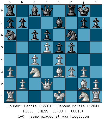 Last move : 1-0 2017 February 27 17:34:37 [Event "FICGS__CHESS__CLASS_F__000184"] [Site "FICGS"] [Date "2016.11.11"] [Round "1"] [White "Joubert,Hennie"] [Black "Benone,Mateia"] [Result "1-0"] [WhiteElo "1228"] [BlackElo "1284"] 1.e4 d6 2.d4 Nf6 3.f3 e5 4.d5 c6 5.c4 Be7 6.Nc3 O-O 7.Be3 Na6 8.a3 Nh5 9.g3 f5 10.Qd2 Nf6 11.Bg2 1-0 King's pawn Opening Kingside Castling by player Black (move 6) Player White won this chess game. Follow this game move after move (download)There is no remorse like the remorse of Chess. (H. G. Wells) Pläne sind die Träume des Verständigen. (Ernst Freiherr von Feuchtersleben) Bendita sea la memoria de aquel que dio al mundo este juego inmortal. (A. G. Gardiner) Le joueur d'Echecs qui veut atteindre le top est obligé de développer son propre credo créatif. Alexeï Stepanovicth Souétine. Il est facile d'écrire des livres ! Ce qui est difficile, c'est de jouer ! (Alexeï Stepanovicth Souétine) Now you put water in a cup, it becomes the cup; You put water into a bottle it becomes the bottle; You put it in a teapot it becomes the teapot. Water can flow or it can crash. Be water, my friend. (Bruce Lee)