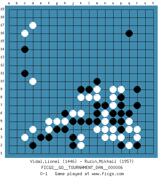 Last move : 0-1 2007 June 13 1:11:17 [Event "FICGS__GO__TOURNAMENT_DAN__000006 "] [Site "FICGS"] [Date "2007.03.31"] [Round "1"] [Black "Vidal,Lionel "] [White "Ruzin,Mikhail "] [Result "0-1"] [Rating 1 "1446"] [Rating 2 "1957"] 1.q16 d17 2.q3 d4 3.c14 c16 4.c11 q5 5.r7 p6 6.p7 o7 7.p8 r3 8.r2 r4 9.p2 o3 10.o6 n6 11.o5 n5 12.p4 o4 13.p5 p3 14.q6 q4 15.p6 q2 16.n7 o8 17.m7 o9 18.n4 m4 19.m5 n3 20.m6 n4 21.m10 p9 22.r9 m9 23.l9 m8 24.k5 l8 25.k9 k8 26.h6 k6 27.l5 j6 28.j5 h5 29.h4 g5 30.g4 k3 31.j3 k2 32.e3 f5 33.d2 c3 34.j2 f4 35.f3 d10 0-1 This go game has been lost on time (started : 2007.03.31 10:30:25) Here are the names of the openings (joseki) played in the four corners : Corner d16 : d17 c14Komoku (Somok, Xiao~mu`) 3-4 Point. The komoku (3-4) point is the traditional corner enclosure move..Nikken Kakari (Dukan Keolch'im, E`r Gua`jiao~, 2-Space Low Approach). Black 2 is used with friendly forces backing it up. Its purpose is to prevent a pincer. Locally it results in a loss, but may be appropriate fuseki strategy. It was popular in the late 1950s and early 1960s, but is not seen often nowadays, having been replaced by the one-space high approach, with which it has points in common. Corner q4 : q3 q5Komoku (Somok, Xiao~mu`) 3-4 Point. The komoku (3-4) point is the traditional corner enclosure move..Ikken Takagakari (Hankan Nop'dakeolch'im, Yi Gaogua`jiao~, 1-Space High Approach). The 5-4 approach move has become more popular in modern times, as modern Go emphasizes speed and influence. Corner d4 : d4 h6Hoshi (Hwajeom, Seongjeom, Xingwei`) 4-4 Point. The star or hoshi (4-4) point, emphasizing influence at the potential expense of territory. Player White won this Go (weiqi, baduk) game.Follow this game move after move (download ) Empty triangles are bad. (Anonymous) The Internet isn't free. It just has an economy that makes no sense to capitalism. (Brad Shapcott)