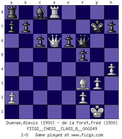 Last move : 1-0 2016 December 25 17:6:11 [Event "FICGS__CHESS__CLASS_B__000249"] [Site "FICGS"] [Date "2016.11.13"] [Round "1"] [White "Duenas,Alexis"] [Black "de la Foret,Fred"] [Result "1-0"] [WhiteElo "1900"] [BlackElo "1900"] 1.d4 f5 2.Nf3 Nf6 3.g3 e6 4.Bg2 Be7 5.O-O O-O 6.c4 c6 7.Nc3 d5 8.h4 dxc4 9.Ne5 Nbd7 10.Nxc4 Nb6 11.Ne5 Nbd7 12.Nf3 Re8 13.e4 fxe4 14.Ng5 Qb6 15.Ngxe4 Nxe4 16.Nxe4 Nf6 17.Qc2 Rd8 18.Rd1 Rxd4 19.Be3 Rxd1+ 20.Rxd1 Qa5 21.Nxf6+ gxf6 22.Rd2 Kg7 23.Be4 f5 24.Bd4+ Kg8 25.Bc3 Bb4 26.Qd1 Bxc3 27.Rd8+ Kg7 28.bxc3 Qxc3 29.Qd6 Qf6 30.Bf3 1-0 Dutch Kingside Castling by player White (move 5) Kingside Castling by player Black (move 5) Player White won this chess game. Follow this game move after move (download)If Chess is a science, it's a most inexact one. If Chess is an art, it is too exacting to be seen as one. If Chess is a sport, it's too esoteric. If Chess is a game, it's too demanding to be just a game. If Chess is a mistress, she's a demanding one. If Chess is a passion, it's a rewarding one. If Chess is life, it's a sad one. (Unknown) Es gibt zwei Arten von Opfern: Korrekte und meine. (Mikhail Nekhemyevich Tal) Cuando estes solo, cuando te sientas un extraño en el mundo, juega al Ajedrez. Esto levantará tu espiritu y será tu consejero de guerra. (Aristóteles) Avant la finale, les dieux ont créé le milieu de partie. (Tarrasch) Luck has a peculiar habit of favoring those who don't depend on it. (Author unknown)