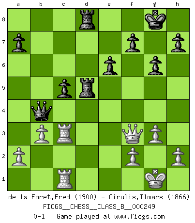 Last move : 0-1 2017 March 12 11:13:2 [Event "FICGS__CHESS__CLASS_B__000249"] [Site "FICGS"] [Date "2016.11.13"] [Round "1"] [White "de la Foret,Fred"] [Black "Cirulis,Ilmars"] [Result "0-1"] [WhiteElo "1900"] [BlackElo "1866"] 1.e4 e6 2.d4 d5 3.Nc3 Nf6 4.e5 Nfd7 5.Nf3 c5 6.g3 cxd4 7.Qxd4 Nc6 8.Qf4 Qc7 9.Nb5 Qb8 10.c4 dxc4 11.Be3 Ndxe5 12.Nxe5 Nxe5 13.Bd4 Bb4+ 14.Nc3 Bd6 15.Bxe5 Bxe5 16.Qxc4 O-O 17.Bg2 Bd7 18.O-O Rc8 19.Qb3 Bc6 20.Bxc6 bxc6 21.Qc2 Bd4 22.Rac1 c5 23.b3 Rd8 24.Qe2 Qb4 25.Qf3 g6 26.Rc2 Bxc3 27.Rxc3 Rd5 28.Rfc1 Rad8 0-1 French : Steinitz variation Kingside Castling by player Black (move 16) Kingside Castling by player White (move 18) Player Black won this chess game. Follow this game move after move (download)One bad move nullifies forty good ones. (Horowitz) Es genügt nicht ein guter Spieler zu sein, man muß auch gut spielen. (Siegbert Tarrasch) Un buen sacrificio es aquel que aunque no sea necesariamente sólido, deja a tu oponente aturdido y confuso. (Rudolph Spielmann) Les échecs, c'est l'art d'analyser. (Mikhail Botvinnik) It is not enough to be a good player... you must also play well. (Siegbert Tarrasch)