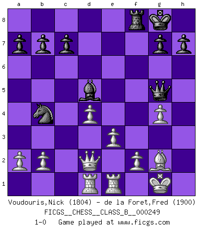 Last move : 1-0 2017 March 14 4:20:48 [Event "FICGS__CHESS__CLASS_B__000249"] [Site "FICGS"] [Date "2016.11.13"] [Round "1"] [White "Voudouris,Nick"] [Black "de la Foret,Fred"] [Result "1-0"] [WhiteElo "1804"] [BlackElo "1900"] 1.d4 f5 2.h3 Nf6 3.g4 d5 4.c4 e6 5.Bg2 Ne4 6.Nf3 Be7 7.gxf5 O-O 8.fxe6 Bxe6 9.cxd5 Bb4+ 10.Nbd2 Bxd5 11.O-O Nxd2 12.Bxd2 Bxd2 13.Qxd2 Nc6 14.Rad1 Qf6 15.Qd3 Rae8 16.Rfe1 Re4 17.e3 Qg6 18.Ne5 Qg5 19.Ng4 Nb4 20.Qd2 Rxg4 21.hxg4 1-0 Dutch, Korchnoi attack Kingside Castling by player Black (move 7) Kingside Castling by player White (move 11) Player White won this chess game. Follow this game move after move (download)You must take your opponent into a deep dark forest where 2+2=5, and the path leading out is only wide enough for one. (Mikhail Tal) Schach ist das Spiel, das die Verrückten gesund hält. (Albert Einstein) Si pudieramos observar el interior de la cabeza de un jugador de Ajedrez, encontraríamos ahí un mundo lleno de sentimientos, imágenes, ideas, emoción y pasión. (Alfred Binet) Les échecs sont un jeu par leur forme, un art par leur essence et une science par sa difficulté d'acquisition. Ils peuvent vous procurer autant de plaisir qu'un bon livre ou une belle musique, mais vous n'aurez une réelle joie que si vous arrivez à bien jouer. (Tigran Petrosian) Wisdom doesn't necessarily come with age. Sometimes age just shows up all by itself. (Tom Wilson)