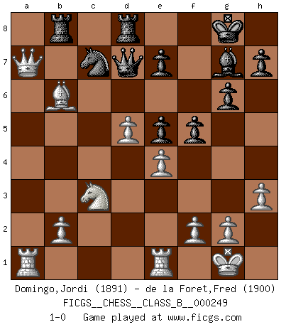 Last move : 1-0 2017 March 14 14:37:57 [Event "FICGS__CHESS__CLASS_B__000249"] [Site "FICGS"] [Date "2016.11.13"] [Round "1"] [White "Domingo,Jordi"] [Black "de la Foret,Fred"] [Result "1-0"] [WhiteElo "1891"] [BlackElo "1900"] 1.e4 c5 2.Nf3 d6 3.c3 Nf6 4.Be2 g6 5.O-O Bg7 6.Bb5+ Bd7 7.Bxd7+ Qxd7 8.Re1 O-O 9.d4 Rd8 10.h3 cxd4 11.cxd4 Nc6 12.Nc3 Rac8 13.d5 Ne5 14.Nxe5 dxe5 15.Qb3 b6 16.a4 Ne8 17.a5 Rb8 18.axb6 Rxb6 19.Qa3 Nc7 20.Qxa7 R6b8 21.Be3 f5 22.Bb6 1-0 Sicilian Kingside Castling by player White (move 5) Kingside Castling by player Black (move 8) Player White won this chess game. Follow this game move after move (download)It is always better to sacrifice your opponent's men. (Savielly Tartakower) Ich war zu klein für die Schach-Schülermannschaft! (Woody Allen) Yo creo que el Ajedrez posee una magia que es también una ayuda en la edad avanzada. Una rodilla reumática es olvidada durante una partida de Ajedrez y otros eventos pueden parecer algo sin importancia comparada a una catástrofe en el tablero de Ajedrez. (Vlastimil Hort) Vous savez, camarade Pachman, je n'éprouve pas de plaisir à être ministre, je jouerais plutôt aux échecs comme vous, ou alors ferais une révolution au Venezuela. (Che Guevara à Ludek Pachman, 'Checkmate in Prague', 1975) May the force be with you. (Han Solo in Star Wars ep.4)