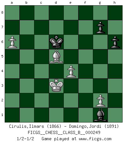 Last move : 1/2-1/2 2017 March 16 22:35:4 [Event "FICGS__CHESS__CLASS_B__000249"] [Site "FICGS"] [Date "2016.11.13"] [Round "1"] [White "Cirulis,Ilmars"] [Black "Domingo,Jordi"] [Result "1/2-1/2"] [WhiteElo "1866"] [BlackElo "1891"] 1.b4 e5 2.a3 d5 3.Bb2 a5 4.b5 Bd6 5.d4 exd4 6.Qxd4 Nf6 7.c4 c5 8.Qe3+ Be6 9.cxd5 Nxd5 10.Qd2 O-O 11.e3 Nd7 12.Nf3 N7b6 13.Nc3 Nxc3 14.Qxc3 f6 15.Qc2 Qe8 16.Bd3 Qh5 17.O-O Bg4 18.Rfd1 Rad8 19.Bc3 c4 20.Be4 Bxh2+ 21.Kf1 Bc7 22.Bxa5 f5 23.Bxb7 f4 24.Rxd8 Rxd8 25.Rd1 Rxd1+ 26.Qxd1 Qxb5 27.Bc3 fxe3 28.fxe3 Qc5 29.Qd4 Qxd4 30.Bxd4 h6 31.Bc6 Be6 32.a4 Nd5 33.e4 Nb4 34.Bb5 Na2 35.Ke2 Ba5 36.Kd1 Nc3+ 37.Bxc3 Bxc3 38.Kc2 Ba5 39.Ne5 Bc7 40.Bxc4 Bxe5 41.Bxe6+ Kf8 42.Kd3 Ke7 43.Bc4 Kd6 44.a5 Bh2 45.a6 Bg1 46.Bd5 1/2-1/2 Polish (Sokolsky) opening Kingside Castling by player Black (move 10) Kingside Castling by player White (move 17) 10 pieces endgame at move 40 : White KBPPP , Black KBBPP WHITE : King + 1 Bishop 3 Pawns BLACK : King + 2 Bishops 2 Pawns 9 pieces endgame at move 41 : White KBPPP , Black KBPP WHITE : King + 1 Bishop 3 Pawns BLACK : King + 1 Bishop 2 Pawns This chess game ended in a draw. Follow this game move after move (download)Pawns are born free, yet they are everywhere in chains. (Rick Kennedy) Kasparov ist eine Art Monster mit hundert Augen, denen auch nicht das Geringste entgeht. (Tony Miles) Nunca nadie ha ganado una partida de Ajedrez rindiendose. (Unknown) Aucun coup ne doit être joué sans but. (Pedro Damiano) Those parts of the system that you can hit with a hammer (not advised) are called hardware; those program instructions that you can only curse at are called software. (Anonymous)