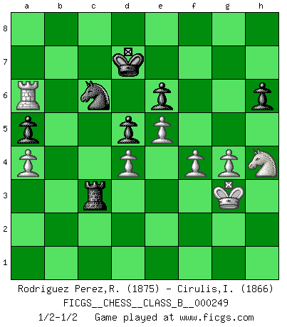 Last move : 1/2-1/2 2016 December 25 22:19:28 [Event "FICGS__CHESS__CLASS_B__000249"] [Site "FICGS"] [Date "2016.11.13"] [Round "1"] [White "Rodriguez Perez,Rene"] [Black "Cirulis,Ilmars"] [Result "1/2-1/2"] [WhiteElo "1875"] [BlackElo "1866"] 1.e4 e6 2.d4 d5 3.e5 Ne7 4.Nf3 c5 5.c3 b6 6.Na3 Nec6 7.h3 Bb7 8.Be2 cxd4 9.cxd4 Bxa3 10.bxa3 Ba6 11.Bxa6 Nxa6 12.Qd3 Nab8 13.Bd2 Ne7 14.O-O Qd7 15.Rac1 Nbc6 16.Rc2 h6 17.Rfc1 O-O 18.a4 a6 19.Rc3 Rfc8 20.Rb1 Rab8 21.Qxa6 Ra8 22.Qb5 Ra5 23.Qb3 Qa7 24.Rxc6 Rxc6 25.Bxa5 bxa5 26.Qb8+ Qxb8 27.Rxb8+ Kh7 28.Rb7 Rc1+ 29.Kh2 Nc6 30.Rxf7 Rd1 31.a3 Kg6 32.Rf8 Rd3 33.Re8 Kf7 34.Ra8 Rxa3 35.Ra6 Rc3 36.Nh4 g5 37.Nf3 Rc4 38.g4 Ke7 39.h4 gxh4 40.Nxh4 Kd7 41.f4 Rc2+ 42.Kg3 Rc3+ 1/2-1/2 French : Advance variation Kingside Castling by player White (move 14) Kingside Castling by player Black (move 17) This chess game ended in a draw. Follow this game move after move (download)When asked, -How is that you pick better moves than your opponents?, I responded: I'm very glad you asked me that, because, as it happens, there is a very simple answer. I think up my own moves, and I make my opponent think up his. (Alexander Alekhine) Es ist schade, dass viele Schachsportler vergessen, wie wichtig Auftreten und angemessene Kleidung sind. (Alexandra Kosteniuk) El sobresalir en el Ajedrez es un signo de una mente intrigante. (Sir Arthur Conan Doyle) A ce moment-là, je menaçais de comprendre la position ! (Clément L'Heureux) Who needs drugs and alcohol if he can play Big Chess at FICGS ? (Heinz-Georg Lehnhoff)