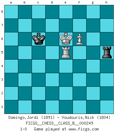 Last move : 1-0 2017 November 15 14:30:57 [Event "FICGS__CHESS__CLASS_B__000249"] [Site "FICGS"] [Date "2016.11.13"] [Round "1"] [White "Domingo,Jordi"] [Black "Voudouris,Nick"] [Result "1-0"] [WhiteElo "1891"] [BlackElo "1804"] 1.e4 e5 2.Nf3 Nf6 3.Nxe5 d6 4.Nf3 Nxe4 5.d4 d5 6.Bd3 Nc6 7.O-O Be7 8.c4 Nb4 9.Be2 Be6 10.Nc3 O-O 11.Ne5 f6 12.Nf3 f5 13.a3 Nc6 14.Qa4 Bf6 15.cxd5 Nxc3 16.bxc3 Bxd5 17.Bc4 Na5 18.Ba2 Bxa2 19.Rxa2 Qd5 20.Re2 Nc4 21.Rfe1 b5 22.Qc2 h6 23.a4 a6 24.Bf4 c5 25.Be5 Bxe5 26.dxe5 Qe6 27.Qb3 Rfe8 28.h4 Rab8 29.axb5 axb5 30.Qc2 Re7 31.h5 Qf7 32.e6 Qxh5 33.Qd3 f4 34.Qe4 Rb6 35.Qxf4 Qd5 36.Qg4 Kh7 37.Re4 g6 38.Qh4 R6b7 39.Rf4 Nd2 40.Qf6 Nxf3+ 41.Rxf3 b4 42.Re5 Qd1+ 43.Kh2 Qd6 44.Rg3 Rg7 45.Rh3 h5 46.Qf4 Kg8 47.Qe4 b3 48.Rd3 Qe7 49.Red5 b2 50.Rd7 Rxd7 51.Rxd7 Qe8 52.e7 Kh7 53.Rc7 Kh6 54.c4 Rf7 55.Rb7 Kh7 56.f3 Rg7 57.Kg1 Kh6 58.Qe3+ Kh7 59.Qxc5 b1Q+ 60.Rxb1 Rxe7 61.Qd4 Rd7 62.Qc3 Qh8 63.Qxh8+ Kxh8 64.c5 Rc7 65.Rc1 Rc6 66.Kf2 Kg7 67.Ke3 Kf6 68.Kd4 Ke7 69.Rb1 Ra6 70.Rb7+ Kd8 71.Rg7 Rf6 72.Ke5 Rc6 73.Kd5 Rf6 74.c6 h4 75.Rh7 Rf4 76.Kc5 Kc8 77.Rh6 g5 78.Rh5 Ra4 79.Kb5 Ra2 80.Rxg5 Rb2+ 81.Kc5 Rc2+ 82.Kd4 Rf2 83.Ke3 Rf1 84.f4 Rg1 85.Kf3 Kc7 86.Rc5 Rf1+ 87.Kg4 Rf2 88.f5 Rxg2+ 89.Kxh4 Rf2 90.Kg5 Rg2+ 91.Kf6 Rg8 92.Kf7 Rg5 93.Ke6 Rh5 94.Re5 Kxc6 95.f6 1-0 Petrov : Classical attack Kingside Castling by player White (move 7) Kingside Castling by player Black (move 10) Promotion Queen by player Black (move 59) 10 pieces endgame at move 63 : White KQRPPP , Black KRPP WHITE : King + 1 Queen 1 Rook 3 Pawns BLACK : King + 1 Rook 2 Pawns 9 pieces endgame at move 63 : White KRPPP , Black KRPP WHITE : King + 1 Rook 3 Pawns BLACK : King + 1 Rook 2 Pawns 8 pieces endgame at move 80 : White KRPPP , Black KRP WHITE : King + 1 Rook 3 Pawns BLACK : King + 1 Rook 1 Pawn 7 pieces endgame at move 88 : White KRPP , Black KRP WHITE : King + 1 Rook 2 Pawns BLACK : King + 1 Rook 1 Pawn 6 pieces endgame at move 89 : White KRPP , Black KR WHITE : King + 1 Rook 2 Pawns BLACK : King + 1 Rook 5 pieces endgame at move 94 : White KRP , Black KR WHITE : King + 1 Rook 1 Pawn BLACK : King + 1 Rook Player White won this chess game. Follow this game move after move (download)You know you're going to lose. Even when I was ahead I knew I was going to lose. - On playing against Fischer. (Andrew Soltis) Ich bin es gewohnt, das die Jugend mir überhaupt keinen Respekt entgegenbringt. (Alexander Morozewich) Si tu oponente te ofrece un empate, trata de averiguar porque piensa él que esta en una posición peor. (Nigel Short) Echiquier : carré parfait, comme la Jérusalem nouvelle décrite par l'auteur de l'Apocalypse, huit cases sur huit, exaltation du chiffre 4, symbole du cosmos aux quatre horizons... où le noir et le blanc, l'ombre et la lumière, le mal et le bien s'entremêlent et se conjuguent. (Robert Couffignal, Le Gambit du poète) Somehow our devils are never quite what we expect when we meet them face to face. (Nelson DeMille)