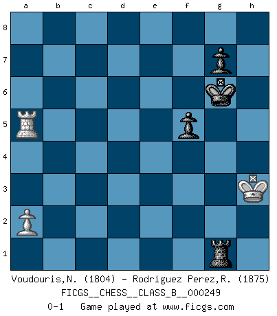 Last move : 0-1 2017 March 24 19:15:41 [Event "FICGS__CHESS__CLASS_B__000249"] [Site "FICGS"] [Date "2016.11.13"] [Round "1"] [White "Voudouris,Nick"] [Black "Rodriguez Perez,Rene"] [Result "0-1"] [WhiteElo "1804"] [BlackElo "1875"] 1.d4 e6 2.e3 Nf6 3.Bd3 d5 4.f4 c5 5.c3 Nc6 6.Nf3 Be7 7.O-O O-O 8.Nbd2 c4 9.Bc2 b5 10.Ne5 Bb7 11.Qf3 Qb6 12.g4 h6 13.g5 hxg5 14.Nxc6 Qxc6 15.fxg5 Ne4 16.Nxe4 dxe4 17.Qg4 Rad8 18.Rf4 Qa6 19.Bxe4 Bxe4 20.Rxe4 Rd5 21.h4 b4 22.cxb4 Bxb4 23.Rf4 c3 24.Rf2 Qd3 25.Qe2 Qe4 26.Rf4 Qg6 27.bxc3 Bxc3 28.Bb2 e5 29.Rg4 exd4 30.exd4 Bxb2 31.Qxb2 Re8 32.Qg2 Rf5 33.Qg3 Qe6 34.Rf4 Rxf4 35.Qxf4 Qd5 36.Rf1 Re4 37.Qb8+ Kh7 38.Qb1 Qxd4+ 39.Kg2 Kg6 40.Rd1 Qe3 41.Qd3 Qxd3 42.Rxd3 Rxh4 43.Ra3 Rg4+ 44.Kh3 Rxg5 45.Rxa7 f5 46.Ra5 Rg1 0-1 Queen's pawn Kingside Castling by player White (move 7) Kingside Castling by player Black (move 7) 10 pieces endgame at move 42 : White KRPPP , Black KRPPP WHITE : King + 1 Rook 3 Pawns BLACK : King + 1 Rook 3 Pawns 9 pieces endgame at move 42 : White KRPP , Black KRPPP WHITE : King + 1 Rook 2 Pawns BLACK : King + 1 Rook 3 Pawns 8 pieces endgame at move 44 : White KRP , Black KRPPP WHITE : King + 1 Rook 1 Pawn BLACK : King + 1 Rook 3 Pawns 7 pieces endgame at move 45 : White KRP , Black KRPP WHITE : King + 1 Rook 1 Pawn BLACK : King + 1 Rook 2 Pawns Player Black won this chess game. Follow this game move after move (download)The isolated Pawn casts gloom over the entire chessboard. (Aaron Nimzovich) Ich verstehe Aljechins Kombinationen ganz gut; aber woher er diese Angriffschancen bekommt und wie er die Eröffnung behandelt das ist für mich ein Buch mit sieben Siegeln. (Rudolf Spielmann) Evita las multitudes. Haz independientemente tu propio razonamiento. Trata de ser el jugador de Ajedrez, no la pieza de Ajedrez. (Ralph Charell) Les écrivains ont utilisé les échecs pour analyser les côtés extrêmes de la nature humaine. Dans ce cadre, les échecs offrent un champ d'expérimentation idéal. Mais on pourrait faire la même chose avec la peinture. Et là, en vous référant à Van Gogh, vous ne tirerez pas de conclusion définitive sur les peintres. (Gary Kasparov) Thibault, I ask for draw. Game 13876. - Sorry Ilmars, you won. (FICGS chat)