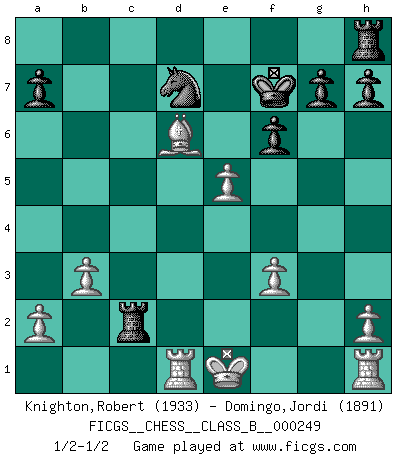 Last move : 1/2-1/2 2017 June 11 10:30:20 [Event "FICGS__CHESS__CLASS_B__000249"] [Site "FICGS"] [Date "2016.11.13"] [Round "1"] [White "Knighton,Robert"] [Black "Domingo,Jordi"] [Result "1/2-1/2"] [WhiteElo "1933"] [BlackElo "1891"] 1.g4 d5 2.Bg2 Bxg4 3.c4 c6 4.Qb3 e6 5.Qxb7 Nd7 6.Nc3 Ngf6 7.Qxc6 Rc8 8.Qa6 Rxc4 9.b3 Rc8 10.Nb5 Bc5 11.Nd6+ Bxd6 12.Qxd6 Ne4 13.Bxe4 Qf6 14.Rb1 dxe4 15.Ba3 Bf5 16.Rd1 e5 17.Qxf6 Nxf6 18.f3 Rc2 19.Bd6 Nd7 20.fxe4 Bxe4 21.Nf3 Bxf3 22.exf3 f6 23.d4 Kf7 24.dxe5 1/2-1/2 Grob : Fritz gambit This chess game ended in a draw. Follow this game move after move (download)In the perfect Chess combination as in a first-rate short story, the whole plot and counter-plot should lead up to a striking finale, the interest not being allayed until the very last moment. (Yates and Winter) Es ist nicht das erste mal, dass sich die FIDE dem Arabischen Geld gebeugt hat (über die FIDE WM 2004 in Lybien). (Larry Evans) A través de las casillas del tablero, los Indios explican el movimiento del tiempo y la edad, las influencias mas altas que controlan el mundo y los lazos que vinculan al Ajedrez con el alma humana. (Al-Masudi) Les ravages du H expliquent la différence de niveau entre Tal et Thal [Abergel]. I take risks, sometimes patients die, but not taking risks causes more patients to die. So I guess my biggest problem is I've been cursed with the ability to do the math. (Gregory House, House M.D.)