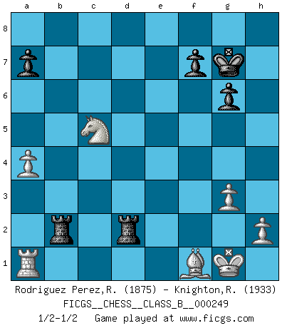 Last move : 1/2-1/2 2017 April 24 0:0:26 [Event "FICGS__CHESS__CLASS_B__000249"] [Site "FICGS"] [Date "2016.11.13"] [Round "1"] [White "Rodriguez Perez,Rene"] [Black "Knighton,Robert"] [Result "1/2-1/2"] [WhiteElo "1875"] [BlackElo "1933"] 1.e4 c5 2.Nf3 g6 3.d4 cxd4 4.Nxd4 Nc6 5.c4 d6 6.Nc3 Bg7 7.Be3 Qa5 8.Be2 Nxd4 9.Bxd4 Bxd4 10.Qxd4 Nf6 11.O-O Be6 12.f4 Rc8 13.f5 Bd7 14.fxg6 hxg6 15.Nd5 Qc5 16.Qxc5 dxc5 17.Rxf6 exf6 18.Nxf6+ Ke7 19.Nxd7 Rh4 20.g3 Rxe4 21.Bf3 Rxc4 22.Ne5 Rc2 23.Bxb7 Rh8 24.Bg2 Rxb2 25.a4 Kf6 26.Nd7+ Kg7 27.Nxc5 Rd8 28.Bf1 R8d2 1/2-1/2 Sicilian : Hungarian variation Kingside Castling by player White (move 11) This chess game ended in a draw. Follow this game move after move (download)Fischer sacrificed virtually everything most of us weakies (to use his term) value, respect, and cherish, for the sake of an artful, often beautiful board game, for the ambivalent privilege of being its greatest master. (Paul Kollar) Mit Schach schule ich mein Gefühl für Geometrie, was für Tennis und Schach gleichermaßen wichtig ist. (Boris Becker) Un mal plan es mejor que no tener ningún plan. (Frank Marshall) Les échecs sont utiles à l'exercice de la faculté de penser et à celle de l'imagination. Car nous devons posséder une méthode élaborée pour atteindre des buts partout où nous devons conduire notre raison. (Leibnitz) There is no vagueness without wind. (Chinese proverb)