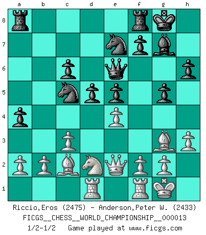 Last move : 1/2-1/2 2017 February 2 14:25:14 [Event "FICGS__CHESS__WORLD_CHAMPIONSHIP__000013"] [Site "FICGS"] [Date "2016.11.16"] [Round "5"] [White "Riccio,Eros"] [Black "Anderson,Peter W."] [Result "1/2-1/2"] [WhiteElo "2475"] [BlackElo "2433"] 1.e4 g6 2.d4 Bg7 3.Nf3 d6 4.Bc4 Nf6 5.Qe2 O-O 6.O-O Bg4 7.c3 Nc6 8.h3 Bxf3 9.Qxf3 e5 10.d5 Ne7 11.Be3 c6 12.dxc6 bxc6 13.Nd2 d5 14.Bb3 a5 15.Bg5 Qd6 16.Ba4 h6 17.Bh4 Qe6 18.Rad1 g5 19.Bg3 Nd7 20.Qe2 Nc5 21.Bc2 a4 22.Qe3 Nd7 23.Qe2 Nc5 24.Qe3 Nd7 25.Qe2 Nc5 1/2-1/2 Robatsch (Modern) defense Kingside Castling by player Black (move 5) Kingside Castling by player White (move 6) This chess game ended in a draw. Follow this game move after move (download)If one piece is badly posted, the whole game is bad. (Tarrasch) Sie bekommen vielleicht den Eindruck, dass die Spitzenspieler überhaupt gar nicht so stark sind. Aber das stimmt nicht. Es ist eine Illusion. Mit einem Computer an der Seite ist es sehr leicht, Urteile zu fällen, aber wenn man alleine am Brett sitzt, sieht die Sache ganz anders aus. (Vladimir Kramnik) El muchacho (en ese entonces un niño de 12 años llamado Anatoly Karpov) no tiene ni idea de lo que es el Ajedrez y no hay futuro en absoluto para el en esta profesión. (Mikhail Botvinnik) Vouloir jouer aux échecs contre soi-même est aussi paradoxal que vouloir marcher sur son ombre. (Stefan Zweig) The obstacle is the path. (Zen proverb)