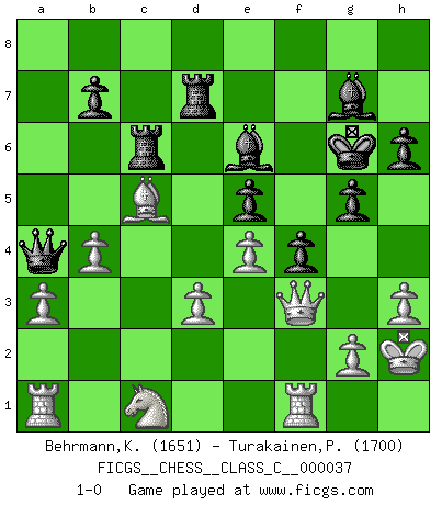 Last move : 1-0 2007 October 27 2:26:46 [Event "FICGS__CHESS__CLASS_C__000037"] [Site "FICGS"] [Date "2007.03.31"] [Round "1"] [White "Behrmann,Klaus"] [Black "Turakainen,Pekka I."] [Result "1-0"] [WhiteElo "1651"] [BlackElo "1700"] 1.e4 c5 2.f4 Nc6 3.Nc3 g6 4.Nge2 Bg7 5.d3 d6 6.Be3 Nf6 7.d4 Ng4 8.Bg1 cxd4 9.Nxd4 Bd7 10.Be2 Qa5 11.Rb1 O-O 12.a3 Rfe8 13.h3 Nxd4 14.Bxd4 e5 15.fxe5 dxe5 16.Bxa7 Red8 17.Bg1 Nf6 18.Bd3 Nh5 19.Bf2 Nf4 20.O-O Be6 21.Qf3 Nxd3 22.cxd3 Rd6 23.Be3 Bb3 24.Ne2 Rad8 25.Nc1 Be6 26.Ra1 Rdc8 27.b4 Qa4 28.Bc5 Rd7 29.Qf2 f5 30.Re1 f4 31.Kh2 Rcd8 32.Rg1 g5 33.Kh1 h6 34.Rf1 Rb8 35.Kh2 Rc8 36.Qe2 Kh7 37.Qe1 Rc6 38.Qf2 Kg6 39.Qf3 1-0 This chess game has been lost on time (started : 2007.03.31 23:17:13) Sicilian : Grand Prix attack Kingside Castling by player Black (move 11) Kingside Castling by player White (move 20) Player White won this chess game. Follow this game move after move (download)Human affairs are like a Chess game: only those who do not take it seriously can be called good players. (Hung Tzu Ch'eng) Matt entspricht nicht immer den Tatsachen. (Savielly Grigorievitsch Tartakower) Una victoria por una combinación errónea, aunque sea espectacular, me llena de horror artístico. (Wilhelm Steinitz) Tout change constamment, y compris dans le monde des Echecs. (Botvinnik) There is no instance of a country having benefited from prolonged warfare. (Sun Tzu)
