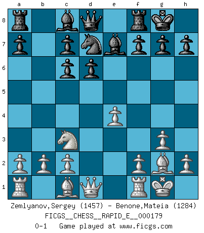 Last move : 0-1 2017 February 25 5:32:47 [Event "FICGS__CHESS__RAPID_E__000179"] [Site "FICGS"] [Date "2016.11.18"] [Round "1"] [White "Zemlyanov,Sergey"] [Black "Benone,Mateia"] [Result "0-1"] [WhiteElo "1457"] [BlackElo "1284"] 1.e4 d6 2.d4 Nf6 3.Nc3 e5 4.Nf3 exd4 5.Nxd4 Be7 6.g3 O-O 7.Bg2 Nc6 8.Nxc6 bxc6 9.O-O Nd7 0-1 This chess game has been lost on time (started : 2016.11.18 1:36:16) Pirc defense Kingside Castling by player Black (move 6) Kingside Castling by player White (move 9) Player Black won this chess game. Follow this game move after move (download)War is the child of passion, passion is the child of narcissism and narcissism is the child. (...) Another game ? (Thibault de Vassal) Er war ein guter Schachspieler, aber ich kann Leute nicht ausstehen, die 'Heil Hitler' rufen (Über Alexander Aljechin). (Miguel Najdorf) El Ajedrez es el juego mas altamente simbólico, pero las agresiones estan por lo tanto aún mas francamente representadas en la partida. Tal vez comenzo como un juego de guerra; Algo como la representación de una batalla en miniatura entre las fuerzas de dos reinos. (Karl Meninger) La guerre est enfant de la passion, la passion est enfant du narcissisme et le narcissisme est l'enfant. (...) Une autre partie ? (Thibault de Vassal) There is no vagueness without wind. (Chinese proverb)