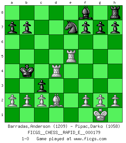 Last move : 1-0 2016 November 30 12:17:32 [Event "FICGS__CHESS__RAPID_E__000179"] [Site "FICGS"] [Date "2016.11.18"] [Round "1"] [White "Barradas,Anderson"] [Black "Pipac,Darko"] [Result "1-0"] [WhiteElo "1209"] [BlackElo "1058"] 1.e4 e5 2.Nf3 Nc6 3.d4 exd4 4.Nxd4 Nxd4 5.Qxd4 c6 6.Bc4 Ne7 7.O-O d5 8.exd5 cxd5 9.Bb5+ Bd7 10.Nc3 Bxb5 11.Nxb5 Nc6 12.Re1+ Ne7 13.Bf4 Rc8 14.Nd6+ Kd7 15.Nxc8 Qxc8 16.Rac1 Qc4 17.Qxc4 dxc4 18.Rcd1+ Kc6 19.Rd6+ Kb5 20.Re5+ Kb4 21.Bd2+ c3 22.Rd4+ 1-0 Scotch game Kingside Castling by player White (move 7) Player White won this chess game. Follow this game move after move (download)I'm not afraid of Spassky. The world knows I'm the best. You don't need a match to prove it. (Bobby Fischer) Fischer: 'Remis!?' Uhlmann: 'Aber es muss doch dreimal Zugwiederholung sein!' Fischer: 'Sie nehmen das Remis an, wie ich es sage, sonst spiele ich weiter und werde Sie dann schlagen!' (Robert James Fischer) Aunque la mayoría de la gente disfruta observar las partidas de los grandes Maestros de ataque, algunos de los jugadores mas notables en la historia han sido los jugadores silenciosos posicionales. Lentamente ellos te aplastan despojandote de tu espacio, congestionando tus piezas y dejandote virtualmente sin nada que hacer. (Yasser Seirawan) Assurément je connaissais par expérience le mystérieux attrait de ce jeu royal, le seul entre tous les jeux inventés par les hommes qui échappe souverainement à la tyrannie du hasard, le seul où l'on ne doive sa victoire qu'à son intelligence ou plutôt à une certaine forme d'intelligence. Mais n'est-ce pas déjà le limiter injurieusement que d'appeler les échecs un jeu ? N'est-ce pas une science, un art ou quelque chose qui, comme le cercueil de Mahomet entre ciel et terre, est suspendu entre l'un et l'autre, et qui réunit un nombre incroyable de contraires ? [...] C'est une pensée qui ne mène à rien, une mathématique qui n'établit rien, un art qui ne laisse pas d'uvre, une architecture sans matière; et il l'a prouvé néanmoins qu'il était plus durable, à sa manière, que les livres ou que tout autre monument, ce jeu unique qui appartient à tous les peuples et à tous les temps, et dont personne ne sait quel dieu en fit don à la terre pour tuer l'ennui, pour aiguiser l'esprit et stimuler l'âme. Où commence-t-il, où finit-il ? (Stefan Zweig) Train yourself to let go of everything you fear to lose. (Master Yoda in Star Wars ep.3)