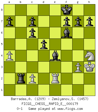 Last move : 0-1 2016 December 17 13:30:18 [Event "FICGS__CHESS__RAPID_E__000179"] [Site "FICGS"] [Date "2016.11.18"] [Round "1"] [White "Barradas,Anderson"] [Black "Zemlyanov,Sergey"] [Result "0-1"] [WhiteElo "1209"] [BlackElo "1457"] 1.e4 e5 2.Nf3 Nc6 3.Bc4 Nf6 4.O-O Nxe4 5.Re1 d5 6.Bb5 Bc5 7.d4 exd4 8.Nxd4 O-O 9.Bxc6 Nxf2 10.Qd2 Ne4 11.Qd3 Qh4 12.g3 Nxg3 13.Qxg3 Bxd4+ 14.Be3 Qxg3+ 15.hxg3 Bxb2 16.Bc5 bxc6 17.Nd2 Bxa1 18.Bxf8 Bd4+ 19.Kg2 Kxf8 20.Nf3 Bf6 21.a4 Rb8 22.Re2 Bf5 23.Nh4 Be4+ 24.Kh3 Rb2 0-1 Two knights defense Kingside Castling by player White (move 4) Kingside Castling by player Black (move 8) Player Black won this chess game. Follow this game move after move (download)I love all positions. Give me a difficult positional game, I will play it. But totally won positions, I cannot stand them. (Hein Donner) Modernes Schach sorgt sich zuviel um Dinge wie Bauernstruktur usw. Vergessen Sie das, Schachmatt beendet das Spiel! (Nigel Short) El Ajedrez es el arte del análisis. (Mikhail Botvinnik) Dans le domaine de la peinture, de la gravure et de la sculpture, dès la première décennie de notre siècle, les artistes abandonnent la représentation de la partie d'échecs pour se concentrer sur les pièces, sur les échiquiers et sur toutes les variations auxquelles les unes et les autres peuvent donner lieu. On passe en quelque sorte d'un thème social à un thème musical (au sens de la musica médiévale, c'est-à-dire d'une notion qui inclue le rythme, l'harmonie, la construction et la déconstruction, etc.). Graphiquement et picturalement, l'échiquier apparaît comme une structure ouverte, dynamique, d'une richesse infinie, autorisant toutes les combinatoires et débouchant sur des mouvements et des rythmes de nature exponentielle. (Michel Pastoureau) The question of whether computers can think is just like question of whether submarines can swim. (Edsger W. Dijkstra)