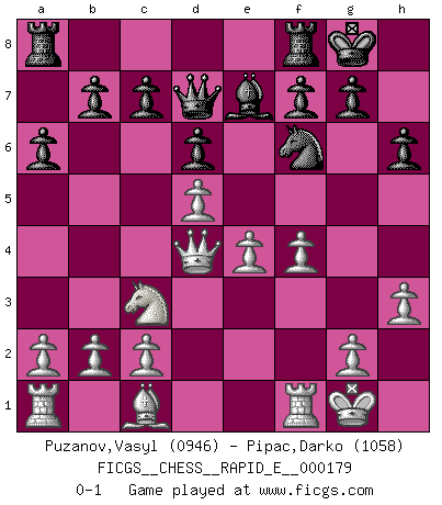 Last move : 0-1 2017 January 4 9:18:52 [Event "FICGS__CHESS__RAPID_E__000179"] [Site "FICGS"] [Date "2016.11.18"] [Round "1"] [White "Puzanov,Vasyl"] [Black "Pipac,Darko"] [Result "0-1"] [WhiteElo "0946"] [BlackElo "1058"] 1.e4 e5 2.Nf3 Nc6 3.Bb5 d6 4.d4 Bd7 5.d5 Nd4 6.Nxd4 exd4 7.Bxd7+ Qxd7 8.Qxd4 Nf6 9.Nc3 a6 10.O-O h6 11.h3 Be7 12.f4 O-O 0-1 Ruy Lopez : Old Steinitz defense Kingside Castling by player White (move 10) Kingside Castling by player Black (move 12) Player Black won this chess game. Follow this game move after move (download)A man without frontiers. He didn't divide the East and the West, he brought them together in their admiration for him. (Ljubomir Ljubojevic, about Bobby Fischer's death) Ich organisiere ein großes Turnier, was mich etwa 120000 Dollar kostet. Ich denke, das ist das erste Mal in der Schachgeschichte, daß ein Schachgroßmeister auch als Mäzen auftritt. (Miguel Najdorf) EL Ajedrez es como la vida. (Boris Spassky) Les échecs, c'est l'art d'analyser. (Mikhail Botvinnik) There are lots of people who mistake their imagination for their memory. (Josh Bilings)