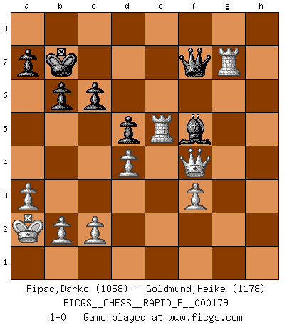 Last move : 1-0 2016 December 19 19:41:3 [Event "FICGS__CHESS__RAPID_E__000179"] [Site "FICGS"] [Date "2016.11.18"] [Round "1"] [White "Pipac,Darko"] [Black "Goldmund,Heike"] [Result "1-0"] [WhiteElo "1058"] [BlackElo "1178"] 1.e4 d5 2.exd5 Qxd5 3.Nc3 Qa5 4.Nf3 Nf6 5.h3 Bf5 6.a3 c6 7.d3 e6 8.Bd2 Qc7 9.Qe2 Bd6 10.O-O-O Nbd7 11.Bg5 O-O-O 12.g4 Bg6 13.h4 h6 14.Bxf6 Nxf6 15.Bh3 Bf4+ 16.Kb1 Nd5 17.Nxd5 exd5 18.Nd4 Rhe8 19.Qf3 Be5 20.Nf5 Qb6 21.d4 Bc7 22.Kc1 Re6 23.g5 hxg5 24.Nxg7 Bf4+ 25.Kb1 Be4 26.Bxe6+ Kb8 27.Qg4 fxe6 28.Rhe1 e5 29.Ne6 Re8 30.Nxf4 exf4 31.hxg5 Qc7 32.Rg1 b6 33.g6 Rg8 34.g7 Qf7 35.Rde1 Qf6 36.f3 Bf5 37.Qxf4+ Kb7 38.Ka2 Qf7 39.Re5 Rxg7 40.Rxg7 1-0 Scandinavian (centre counter) defense Queenside Castling by player White (move 10) Queenside Castling by player Black (move 11) Player White won this chess game. Follow this game move after move (download)Chess is thirty to forty percent psychology. You don't have this when you play a computer. I can't confuse it. (Judith Polgar) Spielt Blackmar-Diemer-Gambit, und das Matt kommt von selbst! (Emil Joseph Diemer) Evita las multitudes. Haz independientemente tu propio razonamiento. Trata de ser el jugador de Ajedrez, no la pieza de Ajedrez. (Ralph Charell) Toute estimation doit être constamment réévaluée. (Jacob Estrin) In theory there is no difference between theory and practice. In practice there is. (Yogi Berra)