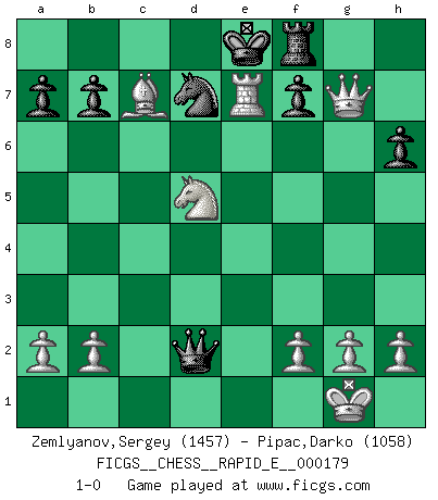 Last move : 1-0 2017 January 4 18:51:5 [Event "FICGS__CHESS__RAPID_E__000179"] [Site "FICGS"] [Date "2016.11.18"] [Round "1"] [White "Zemlyanov,Sergey"] [Black "Pipac,Darko"] [Result "1-0"] [WhiteElo "1457"] [BlackElo "1058"] 1.e4 e5 2.Nf3 Nc6 3.Bb5 d6 4.d4 Bd7 5.Nc3 exd4 6.Nxd4 Nxd4 7.Bxd7+ Qxd7 8.Qxd4 h6 9.O-O Nf6 10.Rd1 Be7 11.e5 dxe5 12.Qxe5 Qc6 13.Bf4 Rd8 14.Rxd8+ Kxd8 15.Rd1+ Ke8 16.Nb5 Nd7 17.Qxg7 Rf8 18.Nxc7+ Kd8 19.Nd5 Qxc2 20.Bc7+ Ke8 21.Re1 Qd2 22.Rxe7+ 1-0 Ruy Lopez : Old Steinitz defense Kingside Castling by player White (move 9) Player White won this chess game. Follow this game move after move (download)The defensive power of a pinned piece is only imaginary. (Aaron Nimzovich) Ich bin Weltmeister und muß mit niemandem irgend etwas diskutieren. (Viswanathan Anand) Te sientas frente a un tablero y repentinamente tu corazón brinca. Tu mano tiembla al tomar una pieza y moverla. Pero lo que el Ajedrez te enseña es que tu debes permanecer ahí con calma y pensar de que si realmente es una buena idea o de que si hay otras ideas mejores. (Stanley Kubrick) Les Echecs, c'est l'art de la guerre sans les charniers, c'est la résurrection des morts tombés au champ d'honneur, l'espoir perpétuel, la suprématie de l'intelligence sur la force, la culture de l'esprit. (F. Szpiner) Rules and bones are meant to be broken. (Anonymous)