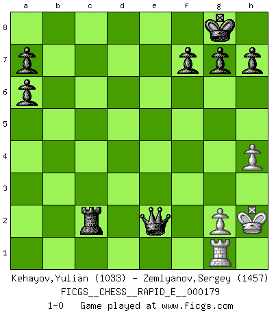 Last move : 1-0 2017 February 22 16:35:51 [Event "FICGS__CHESS__RAPID_E__000179"] [Site "FICGS"] [Date "2016.11.18"] [Round "1"] [White "Kehayov,Yulian"] [Black "Zemlyanov,Sergey"] [Result "1-0"] [WhiteElo "1033"] [BlackElo "1457"] 1.d4 d5 2.Nc3 Nf6 3.e3 c5 4.dxc5 e6 5.Nf3 Bxc5 6.Be2 O-O 7.O-O Nc6 8.Na4 Bd6 9.c4 dxc4 10.b3 cxb3 11.axb3 e5 12.Bb2 Be6 13.Bc4 Qe7 14.Bc3 Bf5 15.Nh4 Bd7 16.f4 Rad8 17.fxe5 Nxe5 18.Bxe5 Bxe5 19.Rc1 Bxa4 20.bxa4 Rxd1 21.Rcxd1 Ng4 22.Nf3 Nxe3 23.Nxe5 Nxd1 24.Rxd1 Qxe5 25.h3 Qc5+ 26.Kh1 Qxc4 27.Rg1 Rc8 28.Kh2 Qe2 29.a5 Rc2 30.a6 bxa6 31.h4 1-0 This chess game has been lost on time (started : 2016.11.18 1:36:16) Queen's pawn : Chigorin variation Kingside Castling by player Black (move 6) Kingside Castling by player White (move 7) Player White won this chess game. Follow this game move after move (download)Later, I began to succeed in decisive games. Perhaps because I realized a very simple truth: not only was I worried, but also my opponent. (Mikhail Tal) Im Spitzenschach von heute geht es nur um Vorbereitung, um tiefgründige, sorgfältige Eröffnungsvorbereitung. (Nigel Short) Si yo gano un torneo, yo lo gano por mí mismo. Yo hago las jugadas. Nadie me ayuda. (Bobby Fischer) Karpov est une pièce de musée. (Garry Kasparov) Luck has a peculiar habit of favoring those who don't depend on it. (Author unknown)