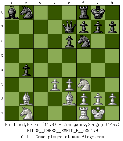 Last move : 0-1 2017 January 13 9:59:58 [Event "FICGS__CHESS__RAPID_E__000179"] [Site "FICGS"] [Date "2016.11.18"] [Round "1"] [White "Goldmund,Heike"] [Black "Zemlyanov,Sergey"] [Result "0-1"] [WhiteElo "1178"] [BlackElo "1457"] 1.b4 Nf6 2.Bb2 e6 3.a3 b6 4.e3 c5 5.c4 cxb4 6.axb4 Bxb4 7.Nf3 O-O 8.Be2 Bb7 9.Qb3 Qe7 10.O-O d5 11.Ra4 a5 12.d3 dxc4 13.Qxc4 b5 14.Qxb5 Bc6 15.Qxb4 axb4 16.Rxa8 Bxa8 0-1 Polish (Sokolsky) opening Kingside Castling by player Black (move 7) Kingside Castling by player White (move 10) Player Black won this chess game. Follow this game move after move (download)Chess is a terrible game. If you have no center, your opponent has a freer position. If you do have a center, then you really have something to worry about ! (Siegbert Tarrasch) Ein Isolani verdüstert die Stimmung auf dem ganzen Schachbrett. (Savielly Grigorievitsch Tartakower) No hay un Gran Maestro de Ajedrez que sea normal; solo se diferencían ellos por la magnitud de su locura. (Viktor Korchnoi) Le jeu d'échecs est comme rejeté hors du temps. (Antoine de Saint-Exupéry) Wawaweewa ! (Borat: Cultural learnings of America for make benefit glorious nation of Kazakhstan)