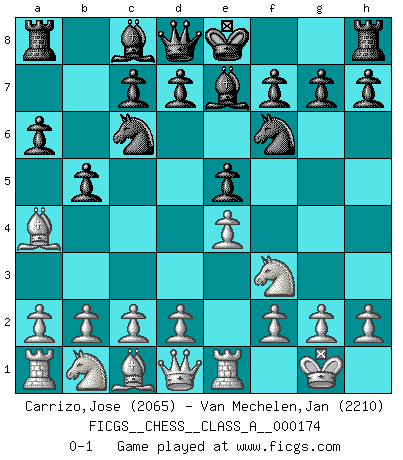 Last move : 0-1 2017 January 3 22:14:5 [Event "FICGS__CHESS__CLASS_A__000174"] [Site "FICGS"] [Date "2016.11.18"] [Round "1"] [White "Carrizo,Jose"] [Black "Van Mechelen,Jan"] [Result "0-1"] [WhiteElo "2065"] [BlackElo "2210"] 1.e4 e5 2.Nf3 Nc6 3.Bb5 a6 4.Ba4 Nf6 5.O-O Be7 6.Re1 b5 0-1 This chess game has been lost on time (started : 2016.11.18 20:36:46) Ruy Lopez : Closed defense Kingside Castling by player White (move 5) Player Black won this chess game. Follow this game move after move (download)A man that will take back a move at Chess will pick a pocket. (Richard Fenton) Ich liebe den Moment, wenn ich das Ego meines Gegenüber breche. (Robert James Fischer) Si no le temes a Spassky, entonces elimino el elemento del dinero. (Jim Slater) Vous m'avez demandé de vous exposer quel est le fondement de la prière. Je ne fais que préparer les pièces du jeu sur la table... Nous sera-t-il permis d'en adopter les règles et si nous les appliquons scrupuleusement nous ne tarderons pas à faire mat le Roi divin ! Il ne pourra échapper à nos mains. (Sainte Thérèse d'Avila, Chemin de perfection) A clear conscience is usually the sign of a bad memory. (Unknown)