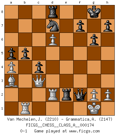 Last move : 0-1 2016 December 28 12:53:46 [Event "FICGS__CHESS__CLASS_A__000174"] [Site "FICGS"] [Date "2016.11.18"] [Round "1"] [White "Van Mechelen,Jan"] [Black "Grammatica,Andrea"] [Result "0-1"] [WhiteElo "2210"] [BlackElo "2147"] 1.d4 Nf6 2.c4 g6 3.Nc3 d5 4.cxd5 Nxd5 5.e4 Nxc3 6.bxc3 Bg7 7.Nf3 c5 8.Be3 Qa5 9.Qd2 Nc6 10.Rb1 a6 11.Rc1 Bg4 12.d5 Rd8 13.Be2 O-O 14.O-O Bxf3 15.Bxf3 e6 16.Rfd1 Ne5 17.Be2 exd5 18.exd5 c4 19.Rb1 b5 20.Bc5 Rfe8 21.d6 Nd7 22.Bb4 Qb6 23.a4 a5 24.Ba3 Bxc3 25.Qxc3 Rxe2 26.Rd2 Qxf2+ 0-1 King's Indian defense, 3.Nc3 Kingside Castling by player Black (move 13) Kingside Castling by player White (move 14) Player Black won this chess game. Follow this game move after move (download)We must make sure that Chess will not be like a dead language, very interesting, but for a very small group. (Sytze Faber) Kein Großmeister ist normal. Sie unterscheiden sich nur im Ausmaß Ihrer Verrücktheit. (Viktor Kortschnoi) Un sacrificio se refuta mucho mejor al aceptarlo. (Wilhelm Steinitz) Les écrivains ont utilisé les échecs pour analyser les côtés extrêmes de la nature humaine. Dans ce cadre, les échecs offrent un champ d'expérimentation idéal. Mais on pourrait faire la même chose avec la peinture. Et là, en vous référant à Van Gogh, vous ne tirerez pas de conclusion définitive sur les peintres. (Gary Kasparov) Chess, like love, like music, has the power to make people happy. (Siegbert Tarrasch)