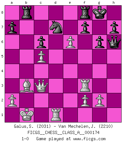 Last move : 1-0 2016 December 31 13:38:32 [Event "FICGS__CHESS__CLASS_A__000174"] [Site "FICGS"] [Date "2016.11.18"] [Round "1"] [White "Galus,Stanislaw"] [Black "Van Mechelen,Jan"] [Result "1-0"] [WhiteElo "2031"] [BlackElo "2210"] 1.d4 d5 2.c4 e6 3.Nf3 Nf6 4.Bg5 Be7 5.e3 O-O 6.Nc3 Nbd7 7.Qc2 c5 8.O-O-O Qa5 9.Kb1 cxd4 10.exd4 Bb4 11.Bd2 dxc4 12.Bxc4 Nb6 13.Bb3 Bd7 14.Ne5 Bc6 15.Nxc6 bxc6 16.h4 Nbd5 17.h5 Rab8 18.h6 g6 19.Rh3 Nxc3+ 20.bxc3 Be7 21.c4 Qc7 22.Rf3 Nd7 23.Bf4 Bd6 24.Bxd6 Qxd6 25.c5 Qe7 26.Qc3 Qg5 27.d5 Qxh6 28.dxe6 1-0 QGD Kingside Castling by player Black (move 5) Queenside Castling by player White (move 8) Player White won this chess game. Follow this game move after move (download)Chess is a foolish expedient for making idle people believe they are doing something very clever when they are only wasting their time. (George Bernard Shaw) Schach ist das schnellste Spiel der Welt, weil man in jeder Sekunde Tausende von Gedanken ordnen muß. (Albert Einstein) El Ajedrez es como la guerra en un tablero. (Bobby Fischer) La vie et les Echecs sont tous les deux une lutte constante. (Lasker) You must do what you feel is right... of course. (Obi-Wan Kenobi in Star Wars ep.4)