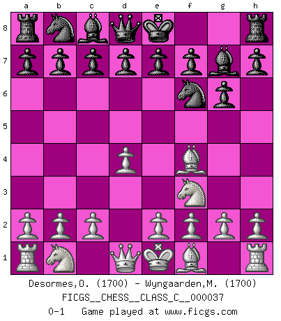 Last move : 0-1 2007 May 12 14:51:59 [Event "FICGS__CHESS__CLASS_C__000037"] [Site "FICGS"] [Date "2007.03.31"] [Round "1"] [White "Desormes,Olivier"] [Black "Wyngaarden,Martin"] [Result "0-1"] [WhiteElo "1700"] [BlackElo "1700"] 1.d4 Nf6 2.Nf3 g6 3.Bf4 Bg7 0-1 This chess game has been lost on time (started : 2007.03.31 23:17:13) King's Indian : London system Player Black won this chess game. Follow this game move after move (download)Fischer is an American Chess tragedy on par with Morphy and Pillsbury. (Mig Greengard) Dein Körper muss in Topform sein. Dein Schach verfällt, wenn dein Körper verfällt. Der Körper kann nicht vom Geist getrennt werden. (Robert James Fischer) Dios mío, Bobby Fischer juega tan simple. (Alexei Suetin) Les Echecs sont et restent toujours un combat, un combat intégral comme la boxe, la lutte ou un autre sport, et où il doit y avoir un vainqueur et un vaincu. (Joseph Emil Diemer) For peace of mind, resign as general manager of the universe. (Douglas Adams)