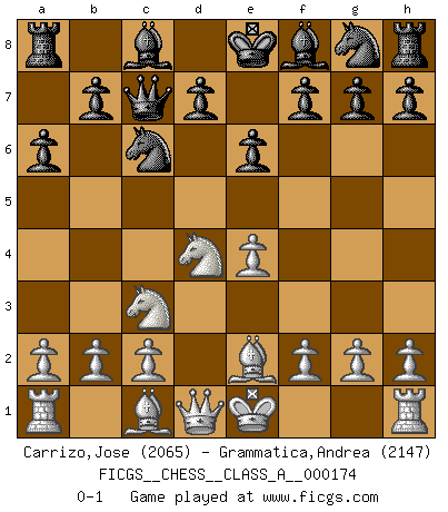 Last move : 0-1 2017 January 4 22:24:56 [Event "FICGS__CHESS__CLASS_A__000174"] [Site "FICGS"] [Date "2016.11.18"] [Round "1"] [White "Carrizo,Jose"] [Black "Grammatica,Andrea"] [Result "0-1"] [WhiteElo "2065"] [BlackElo "2147"] 1.e4 c5 2.Nf3 e6 3.d4 cxd4 4.Nxd4 Nc6 5.Nc3 Qc7 6.Be2 a6 0-1 This chess game has been lost on time (started : 2016.11.18 20:36:46) Sicilian : Taimanov (Bastrikov) variation Player Black won this chess game. Follow this game move after move (download)After black's reply to 1.e4 with 1..e5, leaves him always trying to get into the game. (Howard Staunton) Jeder leidlich begabte Spieler, er braucht keineswegs hervorragend veranlagt zu sein, kann es zum Meister bringen. Aber das ist ja auch gar nicht nötig! Der richtige Standpunkt ist es, zu seinem Vergnügen zu spielen, und man glaube ja nicht, dass der Genuss proportional dem Können sei. (Siegbert Tarrasch) Una mala movida nulifica cuarenta buenas. (Horowitz) On entre au jeu d'Echecs comme on entre en Religion. Pour le joueur d'Echecs, la partie d'Echecs c'est l'office, la messe, le défilé du 1er Mai, le dépôt de gerbe au Monument aux Morts. C'est un drame sacré. (Michel Roos) Internal peace cannot coexist with external war. (Don Groves)