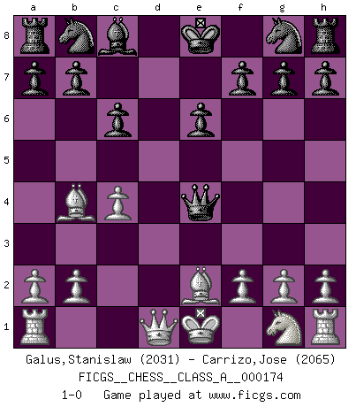 Last move : 1-0 2017 January 3 10:14:23 [Event "FICGS__CHESS__CLASS_A__000174"] [Site "FICGS"] [Date "2016.11.18"] [Round "1"] [White "Galus,Stanislaw"] [Black "Carrizo,Jose"] [Result "1-0"] [WhiteElo "2031"] [BlackElo "2065"] 1.d4 d5 2.c4 e6 3.Nc3 c6 4.e4 dxe4 5.Nxe4 Bb4+ 6.Bd2 Qxd4 7.Bxb4 Qxe4+ 8.Be2 1-0 This chess game has been lost on time (started : 2016.11.18 20:36:46) QGD : Semi-Slav, Marshall gambit Player White won this chess game. Follow this game move after move (download)I know people who have all the will in the world, but still can't play good Chess. (Bobby Fischer) Ich bin der einzige Schachspieler, der sich während der Vorbereitungen zum Turnier verletzt hat. (Woody Allen) Cuando veas una buena jugada, trata de encontrar otra mejor. (Emanuel Lasker) Le succès, c'est être capable d'aller d'échec en échec sans perdre son enthousiasme. (Winston Churchill) Art is the triumph over chaos. (John Cheever)