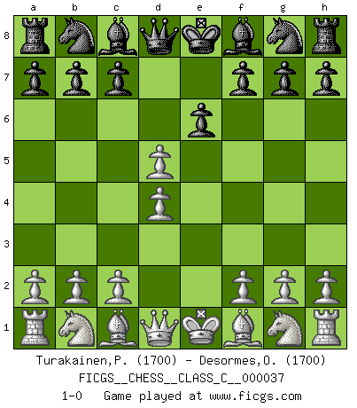 Last move : 1-0 2007 May 13 15:6:44 [Event "FICGS__CHESS__CLASS_C__000037"] [Site "FICGS"] [Date "2007.03.31"] [Round "1"] [White "Turakainen,Pekka I."] [Black "Desormes,Olivier"] [Result "1-0"] [WhiteElo "1700"] [BlackElo "1700"] 1.e4 e6 2.d4 d5 3.exd5 1-0 This chess game has been lost on time (started : 2007.03.31 23:17:13) French : Exchange variation Player White won this chess game. Follow this game move after move (download)Chess, like any creative activity, can exist only through the combined efforts of those who have creative talent, and those who have the ability to organize their creative work. (Mikhail Botvinnik) Kein Schachspieler kann gut schlafen. (H. G. Wells) No hay precio que no valga la pena por la cabellera del Rey enemigo. (Koblentz) La tactique, c'est ce que vous faites quand il y a quelque chose à faire; la stratégie, c'est ce que vous faites quand il n'y a rien à faire. (Savielli Tartacower) I couldn't make any sense out of what this particular thread is about. It sounds like R2 D2 computer speaking. A space fight ?!? Some 'command' problems in Moscow ? Some killers & narcotic addicts attacking some game & a god wannabe ?? (Dinesh De Silva, lost in a russian conflict in FICGS forum)