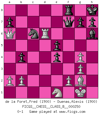 Last move : 0-1 2017 March 4 14:21:14 [Event "FICGS__CHESS__CLASS_B__000250"] [Site "FICGS"] [Date "2016.11.22"] [Round "1"] [White "de la Foret,Fred"] [Black "Duenas,Alexis"] [Result "0-1"] [WhiteElo "1900"] [BlackElo "1900"] 1.e4 c5 2.d4 cxd4 3.c3 dxc3 4.Nxc3 Nc6 5.Nf3 d6 6.g3 Nf6 7.Bg2 e6 8.O-O Be7 9.Re1 O-O 10.Bf4 e5 11.Bg5 Be6 12.Nd5 Rc8 13.Bxf6 Bxf6 14.Rc1 Bg5 15.Rc3 Bh6 16.Qb3 Qd7 17.Rd1 Kh8 18.Qa3 Bg4 19.Rcd3 b5 20.h3 f5 21.Nf6 Rxf6 22.hxg4 fxe4 23.Rxd6 Rxd6 24.Rxd6 Qf7 25.Ne1 b4 26.Qa6 Rf8 0-1 Sicilian : Smith-Morra gambit Kingside Castling by player White (move 8) Kingside Castling by player Black (move 9) Player Black won this chess game. Follow this game move after move (download)Help your pieces so they can help you. (Paul Morphy) Kritik überlasse ich den Spießern. Ich zeige nichts, wofür ich mich schämen muss. (Alexandra Kosteniuk) Para mi, el Ajedrez es la vida y cada partida es como una nueva vida. Todo jugador de Ajedrez suele vivir muchas vidas durante su vida. (Eduard Gufeld) Aux échecs, les retours au sommet sont rares : les dommages psychologiques consécutifs à une défaite sont trop sévères. (Daily Telegraph) Work expands to fill the time available. (C. Northcote Parkinson, in Parkinson's Laws)