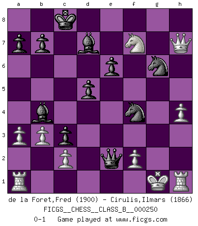 Last move : 0-1 2017 March 4 14:18:4 [Event "FICGS__CHESS__CLASS_B__000250"] [Site "FICGS"] [Date "2016.11.22"] [Round "1"] [White "de la Foret,Fred"] [Black "Cirulis,Ilmars"] [Result "0-1"] [WhiteElo "1900"] [BlackElo "1866"] 1.d4 e6 2.e4 d5 3.Nc3 Bb4 4.e5 c5 5.Qg4 Ne7 6.Qxg7 Rg8 7.Qxh7 cxd4 8.a3 Qa5 9.Bb5+ Bd7 10.Bd3 dxc3 11.b3 Rxg2 12.Nf3 Nbc6 13.Bg5 O-O-O 14.Kf1 Rxg5 15.Nxg5 Nxe5 16.Nxf7 Nxd3 17.Nxd8 Nf4 18.Nf7 Neg6 19.h4 Qb5+ 20.Kg1 Qe2 0-1 Queen's pawn Queenside Castling by player Black (move 13) Player Black won this chess game. Follow this game move after move (download)The Chess pieces are the block alphabet which shapes thoughts; and these thoughts, although making a visual design on the chessboard, express their beauty abstractly, like a poem. (Marcel Duchamp) Mein Gehirn das ist mein zweitwichtigstes Organ [Aus dem Film: Der Schläfer]. (Woody Allen) La maestría del Ajedrez consiste esencialmente en analizar posiciónes de Ajedrez con precisión. (Mikhail Botvinnik) Toutes les manuvres exécutées sur une colonne ouverte ont pour but ultime l'intrusion définitive sur la septième ou la huitième rangée, en plein cur de la position ennemie. (Aaron Nimzovitch) Rules and bones are meant to be broken. (Anonymous)