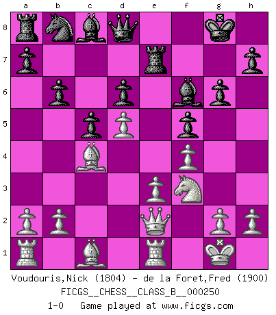 Last move : 1-0 2017 February 26 5:32:39 [Event "FICGS__CHESS__CLASS_B__000250"] [Site "FICGS"] [Date "2016.11.22"] [Round "1"] [White "Voudouris,Nick"] [Black "de la Foret,Fred"] [Result "1-0"] [WhiteElo "1804"] [BlackElo "1900"] 1.d4 f5 2.f4 Nf6 3.Nf3 e6 4.e3 Be7 5.Bd3 O-O 6.O-O c5 7.Qe2 Ne4 8.c4 b6 9.d5 exd5 10.cxd5 Bf6 11.Nfd2 Nxd2 12.Nxd2 d6 13.Nf3 g6 14.Re1 Re8 15.Bb5 Re7 16.Bc4 1-0 This chess game has been lost on time (started : 2016.11.22 14:57:55) Dutch Kingside Castling by player Black (move 5) Kingside Castling by player White (move 6) Player White won this chess game. Follow this game move after move (download)Fischer prefers to enter Chess history alone. (Miguel Najdorf) Ich weiss nicht was Gott gegen mich auf 1.e4 antworten würde. (Robert James Fischer) Puntos débiles o agujeros en la posición de tu oponente deben de ser ocupados por piezas, no Peones. (Siegbert Tarrasch) Assurément je connaissais par expérience le mystérieux attrait de ce jeu royal, le seul entre tous les jeux inventés par les hommes qui échappe souverainement à la tyrannie du hasard, le seul où l'on ne doive sa victoire qu'à son intelligence ou plutôt à une certaine forme d'intelligence. Mais n'est-ce pas déjà le limiter injurieusement que d'appeler les échecs un jeu ? N'est-ce pas une science, un art ou quelque chose qui, comme le cercueil de Mahomet entre ciel et terre, est suspendu entre l'un et l'autre, et qui réunit un nombre incroyable de contraires ? [...] C'est une pensée qui ne mène à rien, une mathématique qui n'établit rien, un art qui ne laisse pas d'uvre, une architecture sans matière; et il l'a prouvé néanmoins qu'il était plus durable, à sa manière, que les livres ou que tout autre monument, ce jeu unique qui appartient à tous les peuples et à tous les temps, et dont personne ne sait quel dieu en fit don à la terre pour tuer l'ennui, pour aiguiser l'esprit et stimuler l'âme. Où commence-t-il, où finit-il ? (Stefan Zweig) When I took office, only high energy physicists had ever heard of what is called the World Wide Web... Now even my cat has its own page. (Bill Clinton, 1996)