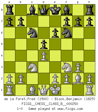 Last move : 1-0 2017 January 15 0:7:53 [Event "FICGS__CHESS__CLASS_B__000250"] [Site "FICGS"] [Date "2016.11.22"] [Round "1"] [White "de la Foret,Fred"] [Black "Block,Benjamin"] [Result "1-0"] [WhiteElo "1900"] [BlackElo "1829"] 1.d4 d5 2.c4 c6 3.cxd5 cxd5 4.Nc3 Nf6 5.g3 e6 6.Bg2 Nc6 7.Nf3 1-0 This chess game has been lost on time (started : 2016.11.22 14:57:55) QGD Slav defense : Exchange variation Player White won this chess game. Follow this game move after move (download)During a Chess competition a Chessmaster should be a combination of a beast of prey and a monk. (Alexander Alekhine) Offensichtlich kennt Kasparow nichts anderes als Schach, und ich könnte 500 weitere Spieler dieser Sorte benennen. (Judith Polgar) Un Peón pasado es un criminal, quién debe ser mantenido bajo candado y llave. Leves medidas, tales como vigilancia policiaca, no son suficientes. (Aaron Nimzovich) Donnez-moi un Cavalier en 6e et je gagnerais toutes mes parties. (Steinitz) A specialist learns more and more about less and less until he knows everything about nothing. (Nicholas Murray Butler)