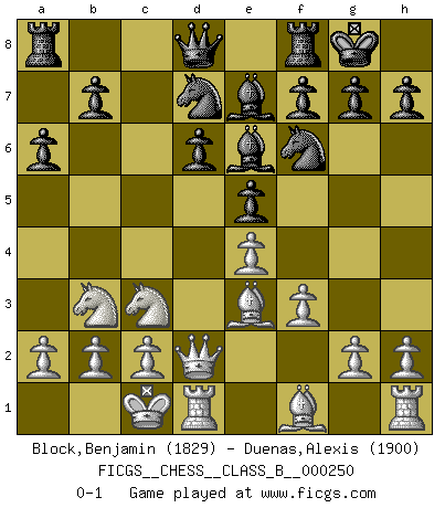Last move : 0-1 2017 February 16 3:42:43 [Event "FICGS__CHESS__CLASS_B__000250"] [Site "FICGS"] [Date "2016.11.22"] [Round "1"] [White "Block,Benjamin"] [Black "Duenas,Alexis"] [Result "0-1"] [WhiteElo "1829"] [BlackElo "1900"] 1.e4 c5 2.Nf3 d6 3.d4 cxd4 4.Nxd4 Nf6 5.Nc3 a6 6.Be3 e5 7.Nb3 Be6 8.f3 Be7 9.Qd2 O-O 10.O-O-O Nbd7 0-1 This chess game has been lost on time (started : 2016.11.22 14:57:55) Sicilian : Najdorf, Byrne (English) attack Kingside Castling by player Black (move 9) Queenside Castling by player White (move 10) Player Black won this chess game. Follow this game move after move (download)Chess is like life. (Boris Spassky) Warum muß ich gegen diesen IDIOTEN verlieren? (Aaron Nimzowitsch) La vida es como el Ajedrez, con lucha, competición y eventos buenos y malos. (Benjamin Franklin) Nous sommes les pions de la mystérieuse partie d'Echecs jouée par Dieu. Il nous déplace, nous arrête, nous pousse encore, puis nous lance un à un dans la boîte du Néant. Epitaphe sur la tombe de David Janowsky (1868-1927). Computer Science is no more about computers than astronomy is about telescopes. (Edsger W. Dijkstra)