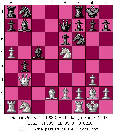 Last move : 0-1 2016 December 17 1:46:12 [Event "FICGS__CHESS__CLASS_B__000250"] [Site "FICGS"] [Date "2016.11.22"] [Round "1"] [White "Duenas,Alexis"] [Black "Oortwijn,Ron"] [Result "0-1"] [WhiteElo "1900"] [BlackElo "1993"] 1.d4 d5 2.c4 c6 3.Nf3 Nf6 4.g3 dxc4 5.Bg2 b5 6.O-O e6 7.a4 Bb7 8.b3 cxb3 9.Qxb3 b4 10.a5 c5 11.dxc5 Bxc5 12.Bd2 Qe7 13.Ne5 O-O 0-1 QGD Slav : 3.Nf3 Kingside Castling by player White (move 6) Kingside Castling by player Black (move 13) Player Black won this chess game. Follow this game move after move (download)On the chessboard, lies and hypocrisy do not survive long. (Emanuel Lasker) Ohne Leiden bildet sich kein Charakter. (Ernst Freiherr von Feuchtersleben) Todavía soy una víctima del Ajedrez. Tiene toda la belleza del arte y mucho mas. No puede ser comercializado. El Ajedrez es mas puro que el arte en su posición social. (Marcel Duchamp) En blitz, le Cavalier l'emporte sur le Fou. (Vlastimil Hort) CHESS, n. f. [echecs, Fr.] A nice and abstruse game, in which two sets of puppets are moved in opposition to each other. (Dr Samuel Johnson, A Dictionary Of The English Language, 1755)