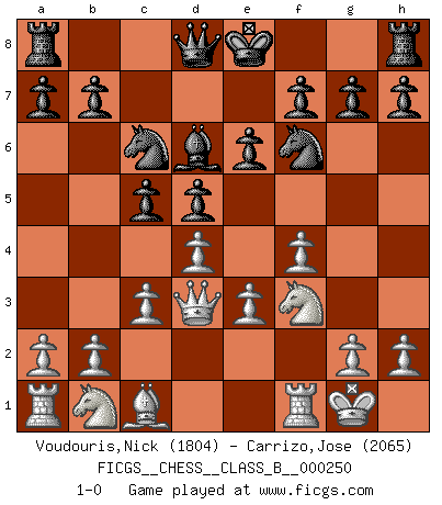 Last move : 1-0 2017 January 10 6:36:39 [Event "FICGS__CHESS__CLASS_B__000250"] [Site "FICGS"] [Date "2016.11.22"] [Round "1"] [White "Voudouris,Nick"] [Black "Carrizo,Jose"] [Result "1-0"] [WhiteElo "1804"] [BlackElo "2065"] 1.d4 d5 2.e3 Nf6 3.Bd3 c5 4.c3 Nc6 5.f4 Bg4 6.Nf3 e6 7.O-O Bd6 8.Qe1 Bf5 9.Qe2 Bxd3 10.Qxd3 1-0 Queen's pawn : Stonewall attack Kingside Castling by player White (move 7) Player White won this chess game. Follow this game move after move (download)Your body has to be in top condition. Your Chess deteriorates as your body does. You can't separate body from mind. (Bobby Fischer) Schach ist eine Sache der genauen Beurteilung, wann man zuschlagen und wann man sich ducken muss. (Robert James Fischer) Aún deseo matar a Fischer. (Boris Spassky) Le succès, c'est être capable d'aller d'échec en échec sans perdre son enthousiasme. (Winston Churchill) Tomorrow's what you make of it. (Horatio Caine, C.S.I. Miami)
