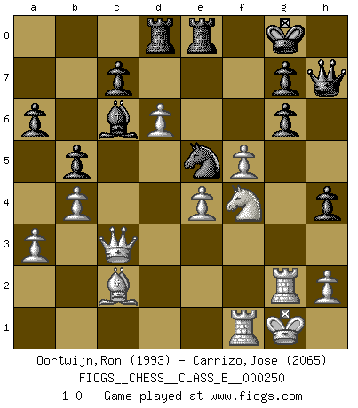 Last move : 1-0 2017 April 5 19:18:21 [Event "FICGS__CHESS__CLASS_B__000250"] [Site "FICGS"] [Date "2016.11.22"] [Round "1"] [White "Oortwijn,Ron"] [Black "Carrizo,Jose"] [Result "1-0"] [WhiteElo "1993"] [BlackElo "2065"] 1.e4 e5 2.Nf3 Nc6 3.Bb5 a6 4.Ba4 d6 5.c3 Bd7 6.O-O Nge7 7.d4 Ng6 8.Be3 h6 9.Nbd2 Be7 10.Re1 Bg5 11.Nf1 Bxe3 12.Nxe3 O-O 13.Bc2 Re8 14.Rc1 Nh4 15.Nxh4 Qxh4 16.g3 Qg5 17.dxe5 Qxe5 18.Nd5 Rac8 19.f4 Qe6 20.a3 Ne7 21.Ne3 Bc6 22.Qd3 Qg6 23.Rcd1 h5 24.Ng2 Qh6 25.Nh4 Bd7 26.b4 Bg4 27.Rd2 Ng6 28.Ng2 h4 29.Ne3 Bd7 30.c4 Nf8 31.Qc3 Qh5 32.Rf2 Ng6 33.Rg2 b6 34.g4 Qh6 35.g5 Qh5 36.Rf1 Bc6 37.Nd5 b5 38.f5 Ne5 39.Nf4 Qh7 40.g6 fxg6 41.c5 Rcd8 42.cxd6 1-0 Ruy Lopez : Modern Steinitz defense Kingside Castling by player White (move 6) Kingside Castling by player Black (move 12) Player White won this chess game. Follow this game move after move (download)Chess is life. (Bobby Fischer) Wenn Schach ein enormer Dschungel ist, der seine Myriaden von Geheimnissen nicht preisgeben will, dann sind Computer die Kettensägen einer gewaltigen ökologisch unsensiblen Nutzholzfirma. (Nigel Short) Yo nunca en mi vida he jugado la Defensa Francesa, que viene siendo la más aburrida de todas las Aperturas. (Wilhelm Steinitz) Shah mat. Le roi est mort. Cri de fierté d'un joueur venant de terrasser son adversaire, courtoisement, sans effusion de sang. There will be no order, only chaos. (Sol Robeson in Pi by Darren Aronofsky)